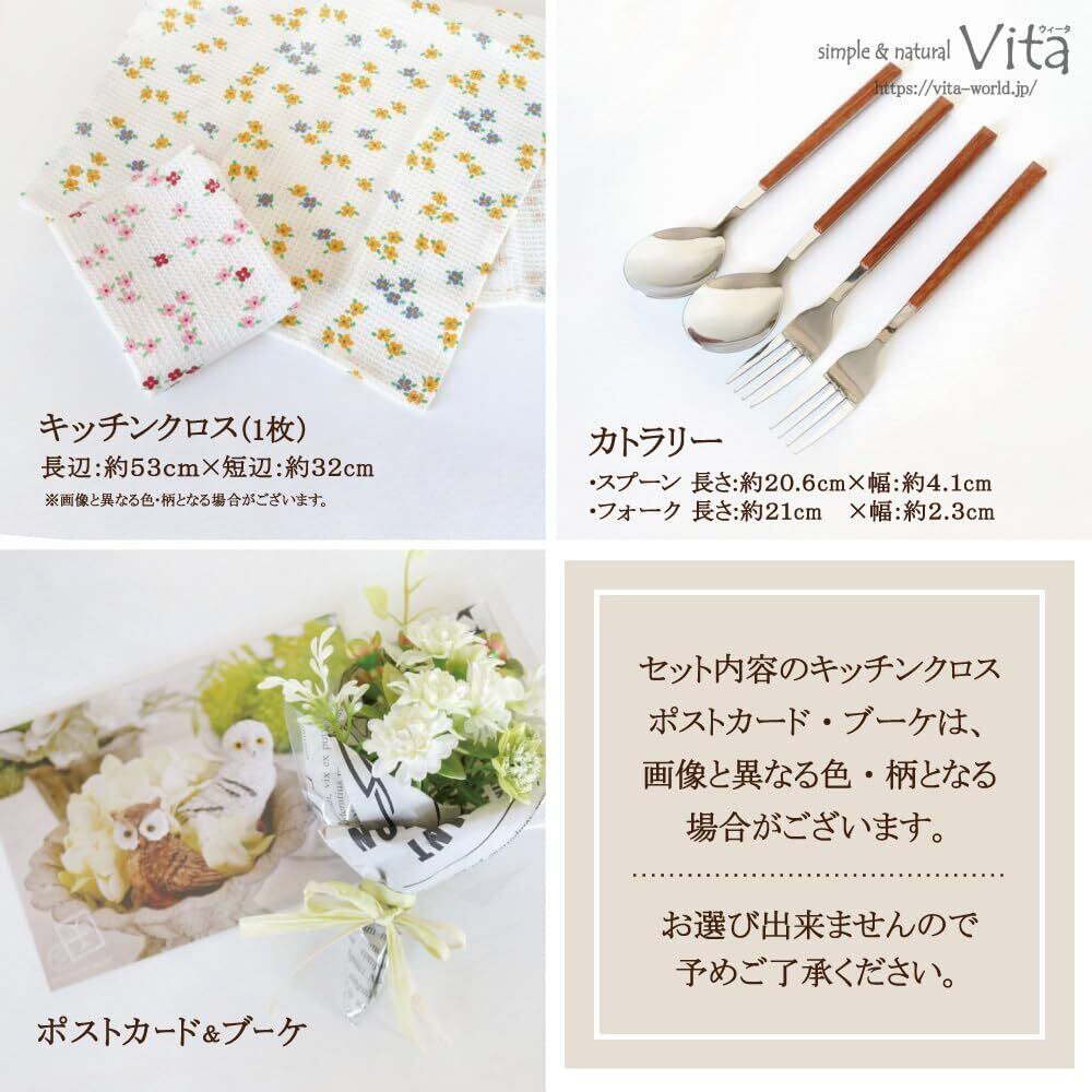 ※キッチンクロス、ブーケ、ポストカードの色合い・絵柄等はお任せとなります。 ※陶食器は釉薬の付き方により、一つ一つの色合い等が異なる場合がございます。予めご了承くださいませ。※【Vitaオリジナルブーケ】「アーティフィシャルフラワー(造花)」を使用した、ミニブーケです。ずっとキレイが続くので、インテリアとしても飾って楽しんで頂けます。