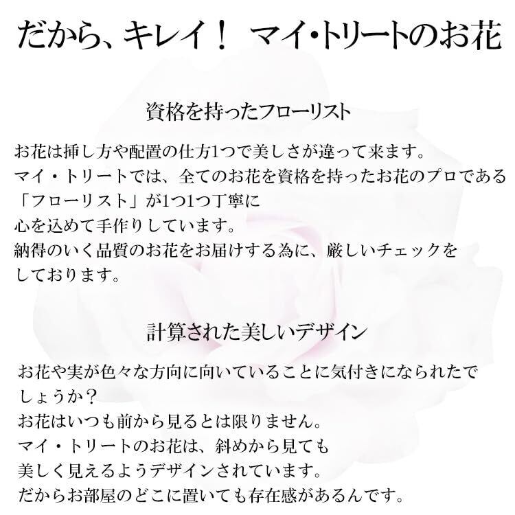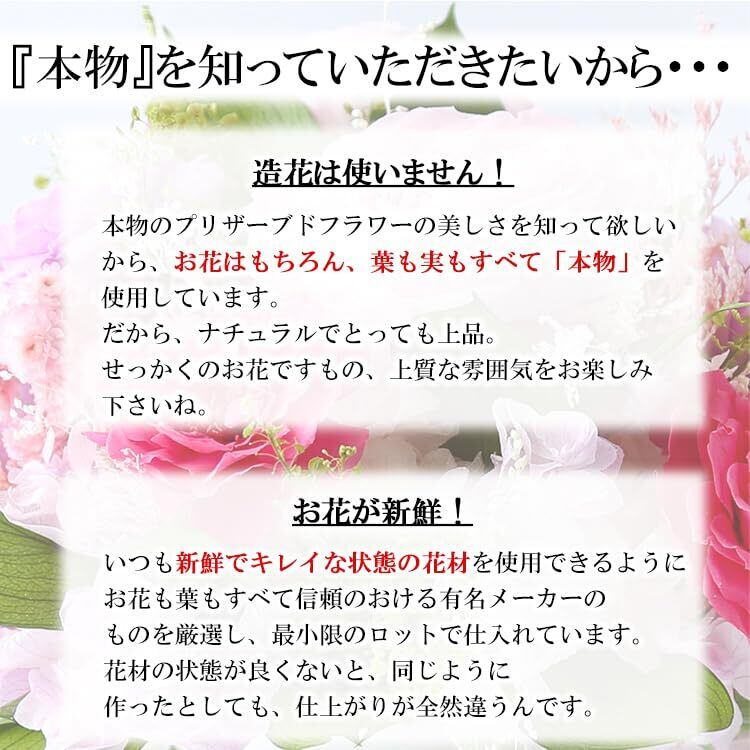 ●【造花は使いません】本物のプリザーブドフラワーの美しさを知って欲しい から、お花はもちろん、葉も実もすべて「本物」を 使用しています。 だから、ナチュラルでとっても上品。 せっかくのお花ですもの、上質な雰囲気をお楽しみ 下さいね。
