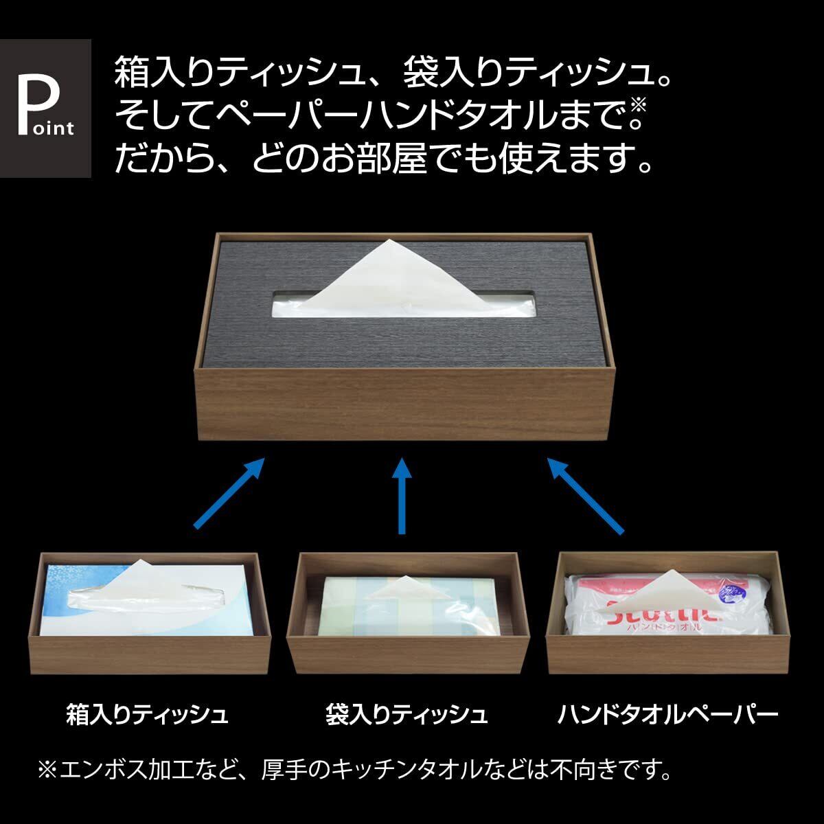 箱入りティッシュ、袋入りティッシュ。そしてペーパータオルまで。(エンボス加工など、厚手のキッチンタオルなどは不向きです。)だから、どのお部屋でも使えます。●衛生管理に気をつかうことが多い昨今、ティッシュの使用頻度も高まっています。だから、デザインや構造は、できるだけシンプルで使いやすいことに重点を置いて作りました。箱入りティッシュ、袋入りティッシュ、そして薄手のハンドタオルペーパーの収納ができます。袋入りティッシュは残量が少なくなってもスムーズに取り出せるよう、天板のカバーは落とし蓋式です。また、ティッシュケースを持ち運ぶときに重く感じないよう、繊細な2.5mmの板材を使用して480gクラスの本体重量を実現。天板カバー部分は厚めの5.5mmの板材を使用し、各カラーともブラックに統一したコントラスト感のある仕様です。
