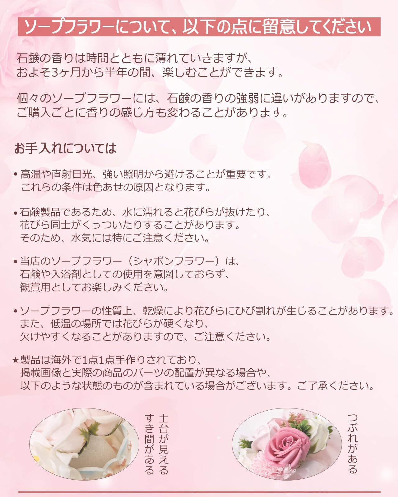 3. 長持ちするインテリアアイテム 本物の花のように見えるソープフラワーは、枯れることがなく、長期間にわたって美しさを楽しめます。手間がかからず、インテリアとしておしゃれな雰囲気を保ちたい方、雑貨が好きな方に特に人気があります。