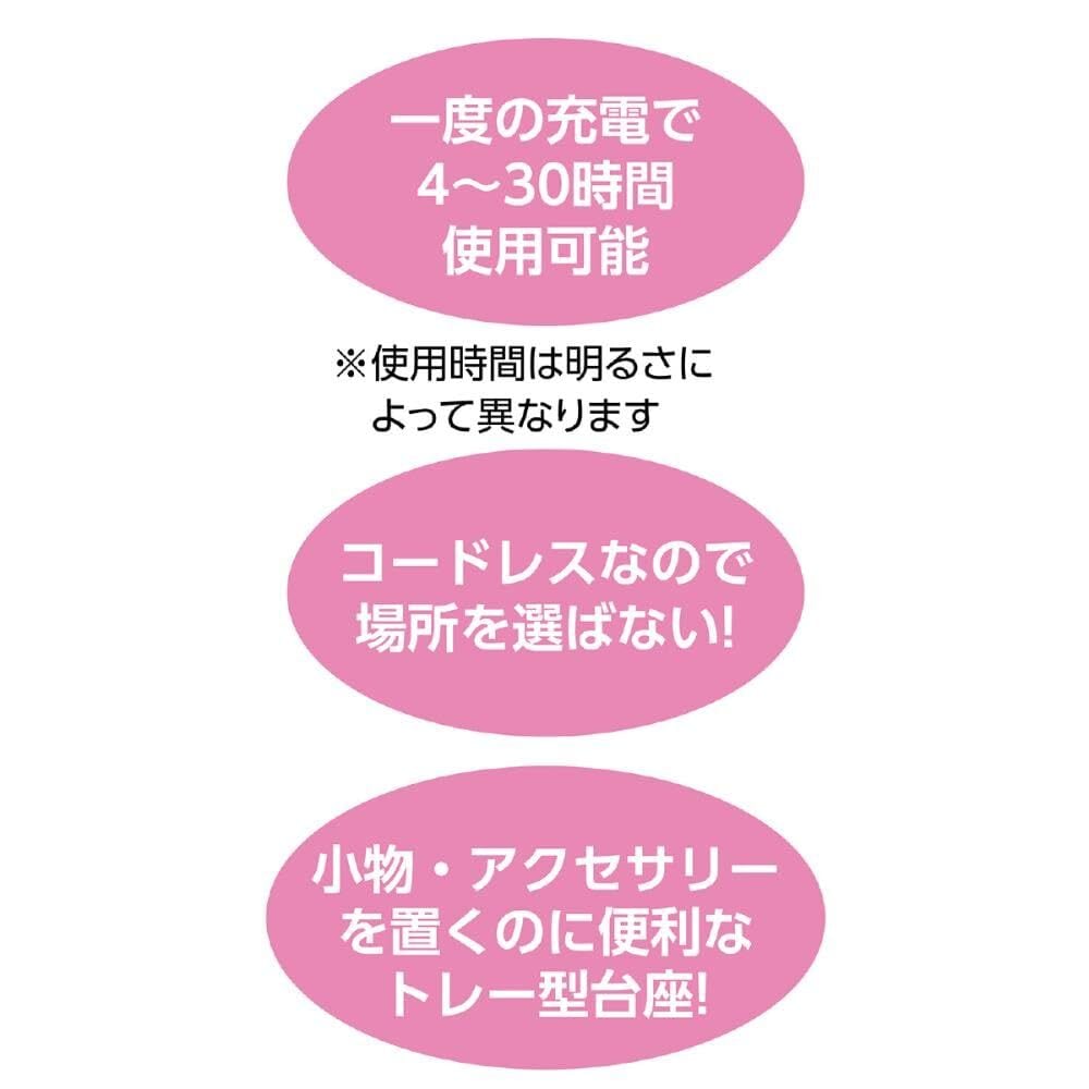 自然光に近いライトがやさしく照らしてくれるのでメイクがしやすい!コードレスなので場所を選ばない! LED・ミラー部の角度調節可能小物・アクセサリーを置くのに便利なトレー型台座!一度の充電で4~30時間使用可能 ※使用時間は明るさによって異なります