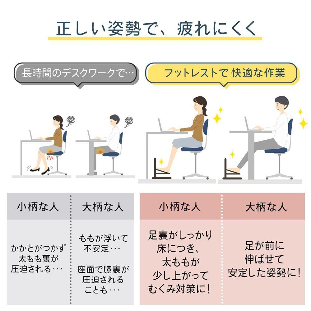 自分の体格に合わせて、高さを6段階に変更できるフットレストです。オフィスワークでも、在宅ワークでも、お使いいただけます。