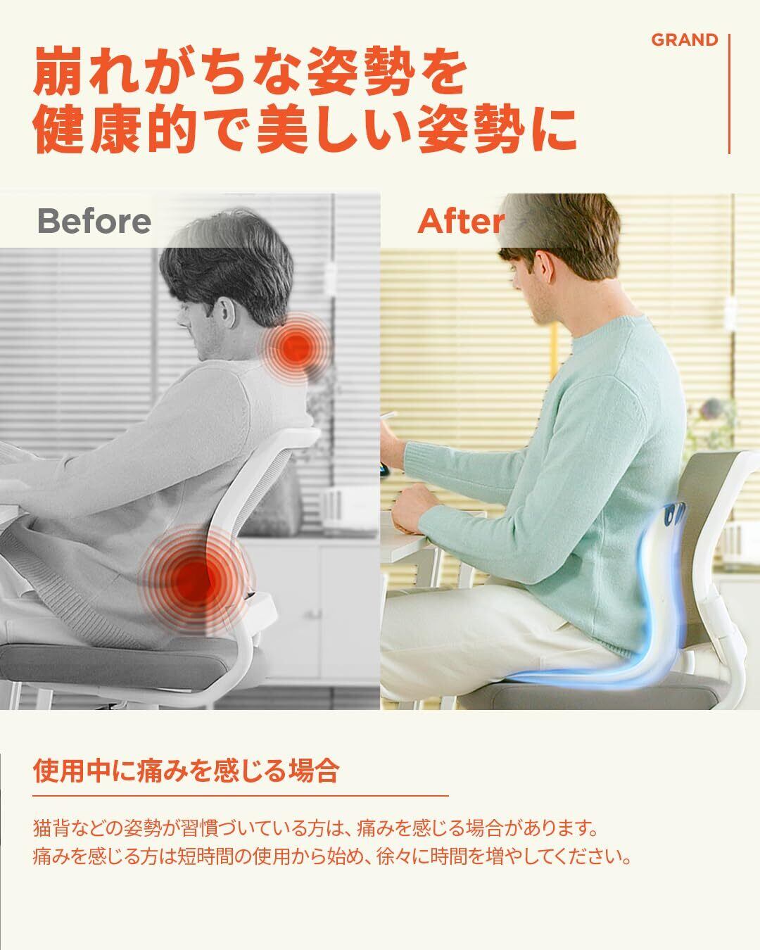 【骨盤をがっちりサポート】従来のモデルから本体フレームがさらに進化しました。背もたれが2つに分割され、お尻はもちろん背中から骨盤をがっちりサポートすることにより、自然で綺麗なS字カーブの姿勢を作ることができます。耐荷重は約210kgあるため、どんな方でも安心してお使いいただくことができます。