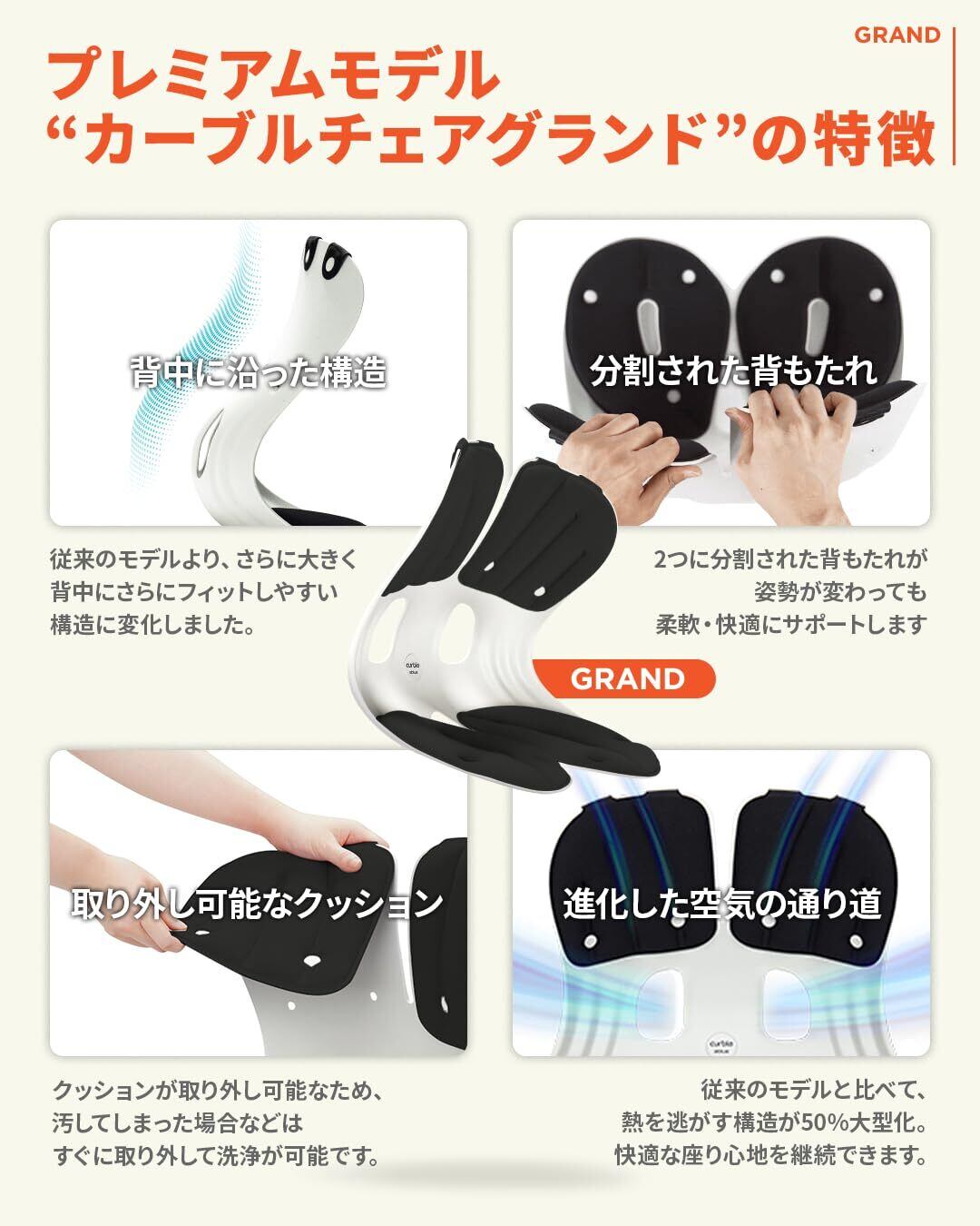 【座るだけで簡単に骨盤から姿勢サポート】カーブルチェアのプレミアムモデルが新登場。長時間座った際の座り心地にフォーカスを当てて「長く、快適に」お使いいただけるように設計されました。カーブルチェアの基本であるテコの原理を利用した人間工学に基づいた設計で、座り仕事在宅ワークはもちろん、床に置いて座椅子としてもお使いいただけます。