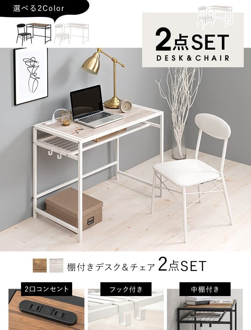 萩原(Hagihara) デスクセット チェア付 デスク イス セット 【便利な中棚収納付き】 コンセント付き 1500W 幅90 奥行50 高さ72 勉強机 テレワーク ホワイト LDC-4658WH