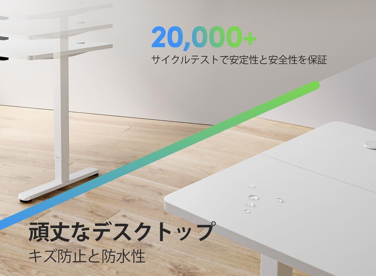【高品質な素材と耐久性】FEZIBO天板がメラミン技術を加工しており、水・熱・傷・汚れに強い天板です。フレームは工業用の頑丈なスチール製で、デスクと昇降の安定性を確保します。1万回の昇降耐久性試験済み!(弊社試験基準にて実施)。