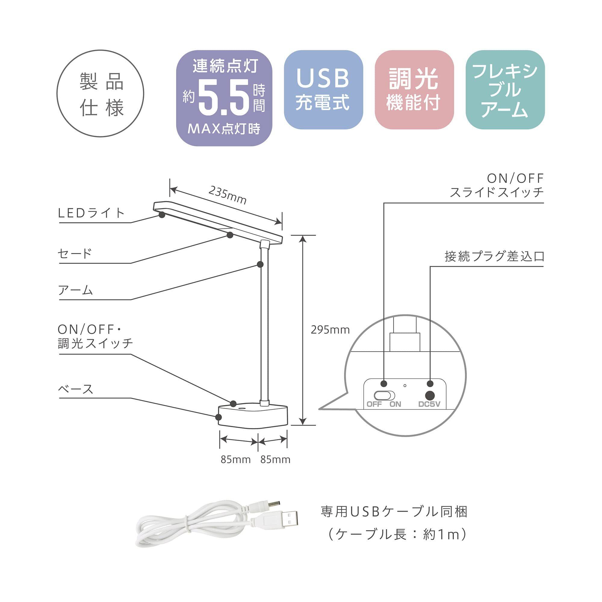 コンセントのない場所でも使えるスリム設計。連続点灯時間 約5.5時間(MAX点灯時)