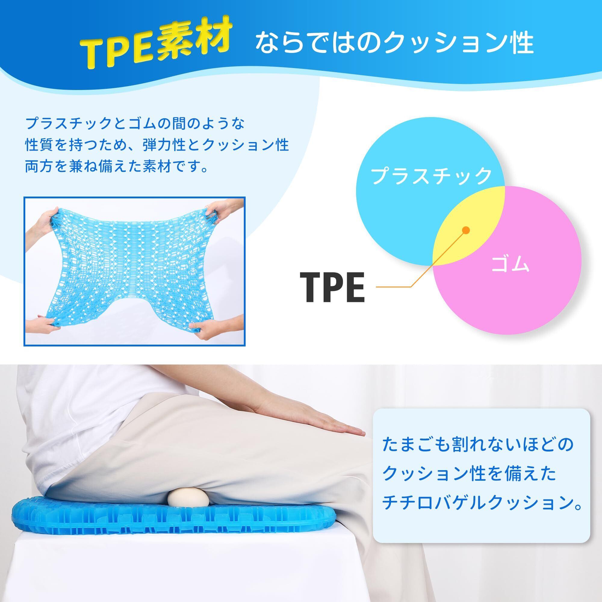 【網目構造&TPE素材・蒸れにくい】クッションにはたくさんの通気孔が空いており、なおかつTPE素材をしているため、通気性はぐっどです。ほどよい硬さで、冷えず蒸れず、快適にお使いいただけます。