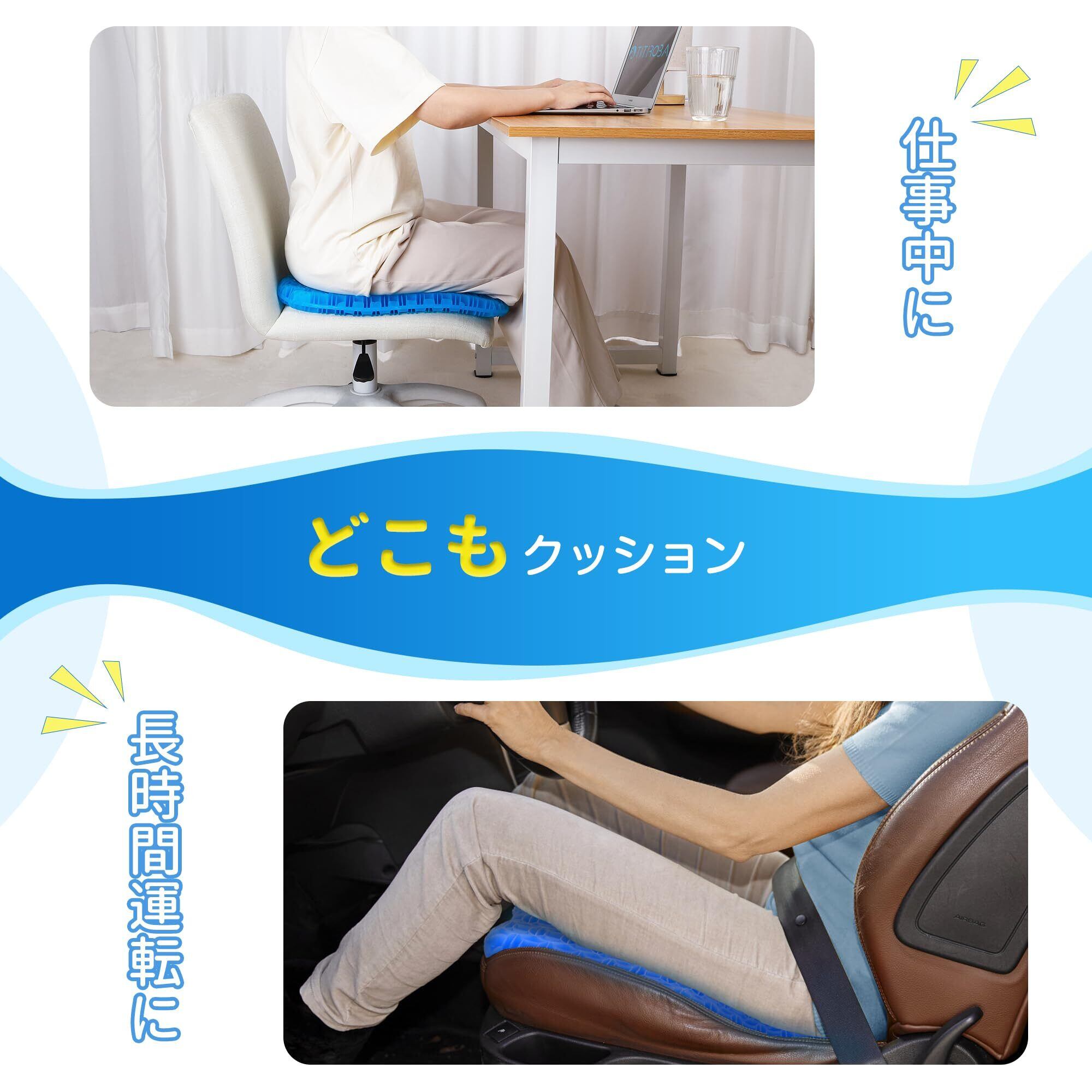 【どこもクッション・どこも使える】オフィスはもちろん、勉強、運転、ゲーミング用やアウトドアなどさまざまなシーンに適しています。子供から大人まで幅広い年齢層の方にお使い頂けるゲル座布団です。