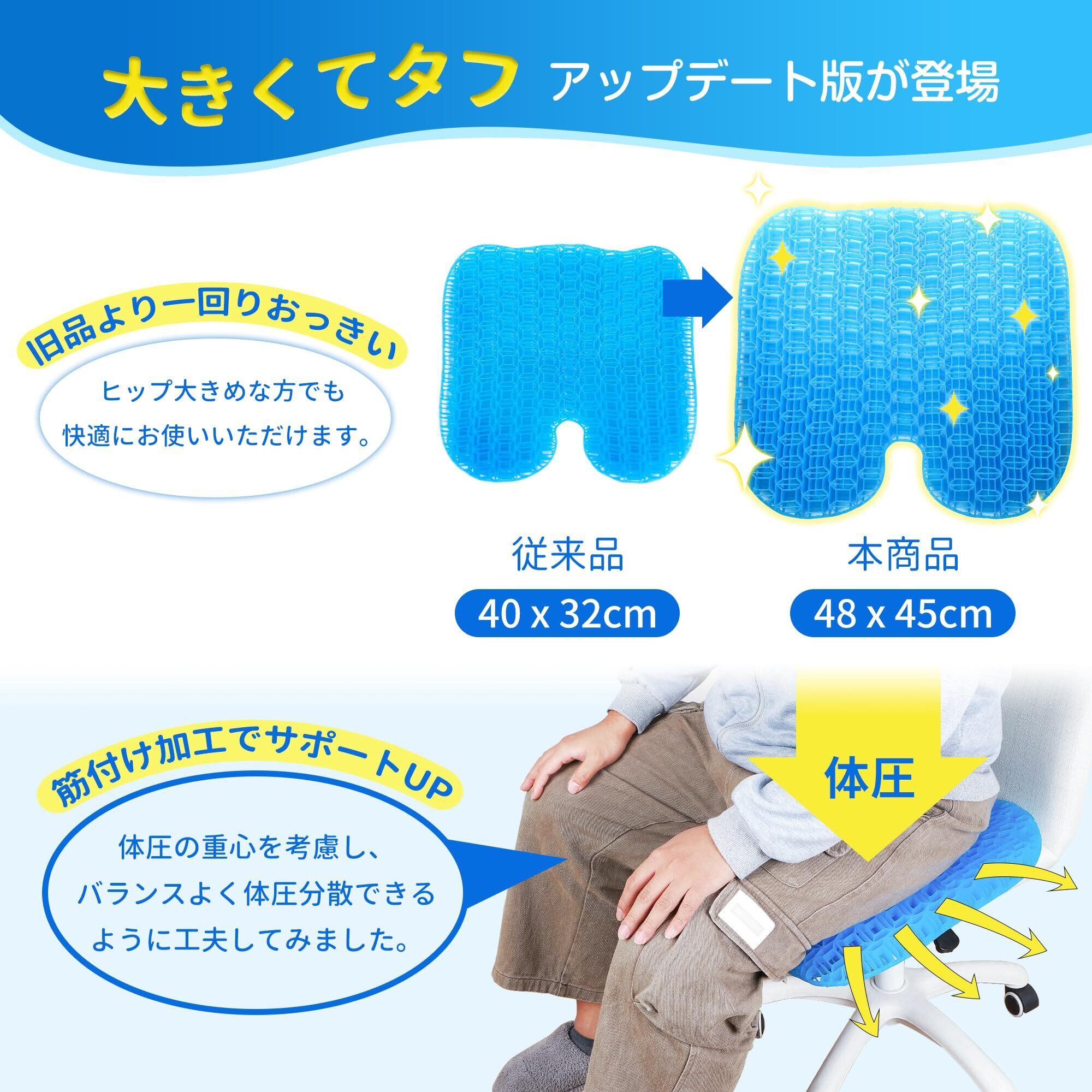【ビッグでしっかりしたゲルクッション】従来品より一回り大きいクッションで。さらに、体をしっかり受け止めれるように、通常品より「密」な網目構造にデザインされており、大柄な方でも気持ちよくお使いいただける、頼れる座布団です。