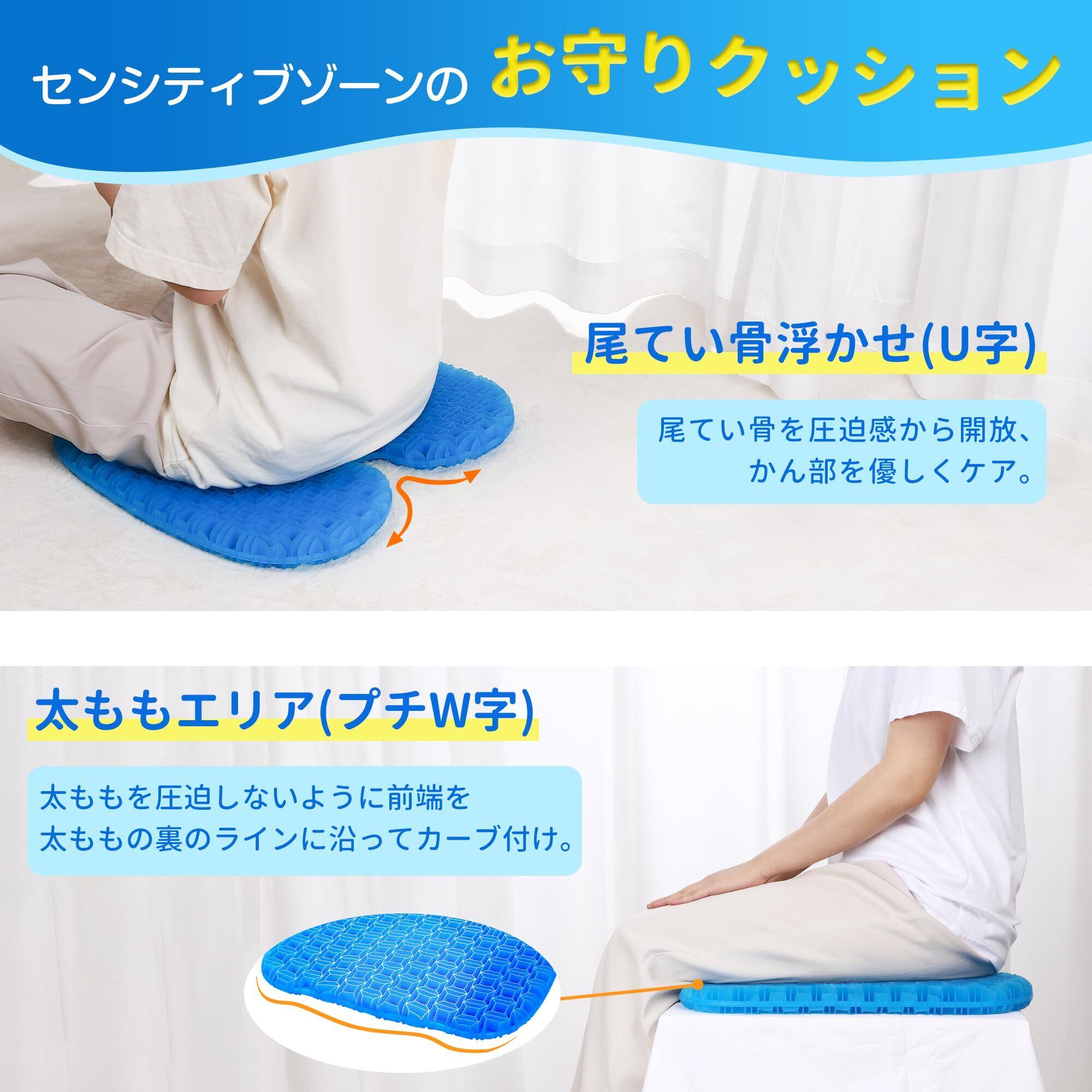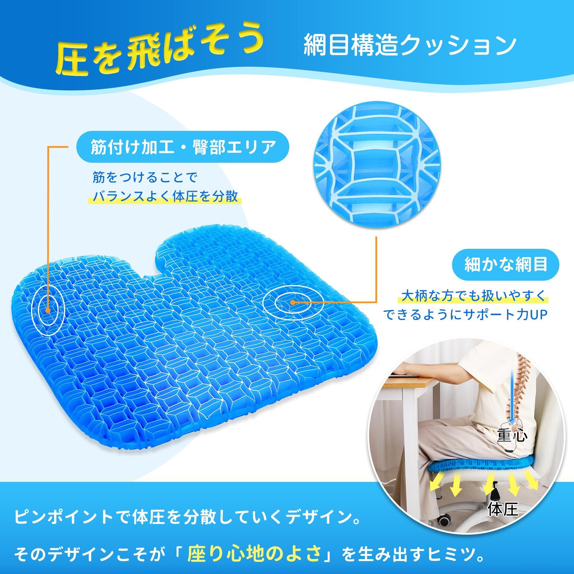 【人体工学デザイン・体圧分散】今までにない、座る際の体の重心のバランスを考えた、U字型ゲルクッションであり、臀部に筋付け加工すること、よりバランスよく体圧を分散させ、座りから来るストレスを一気に軽減。