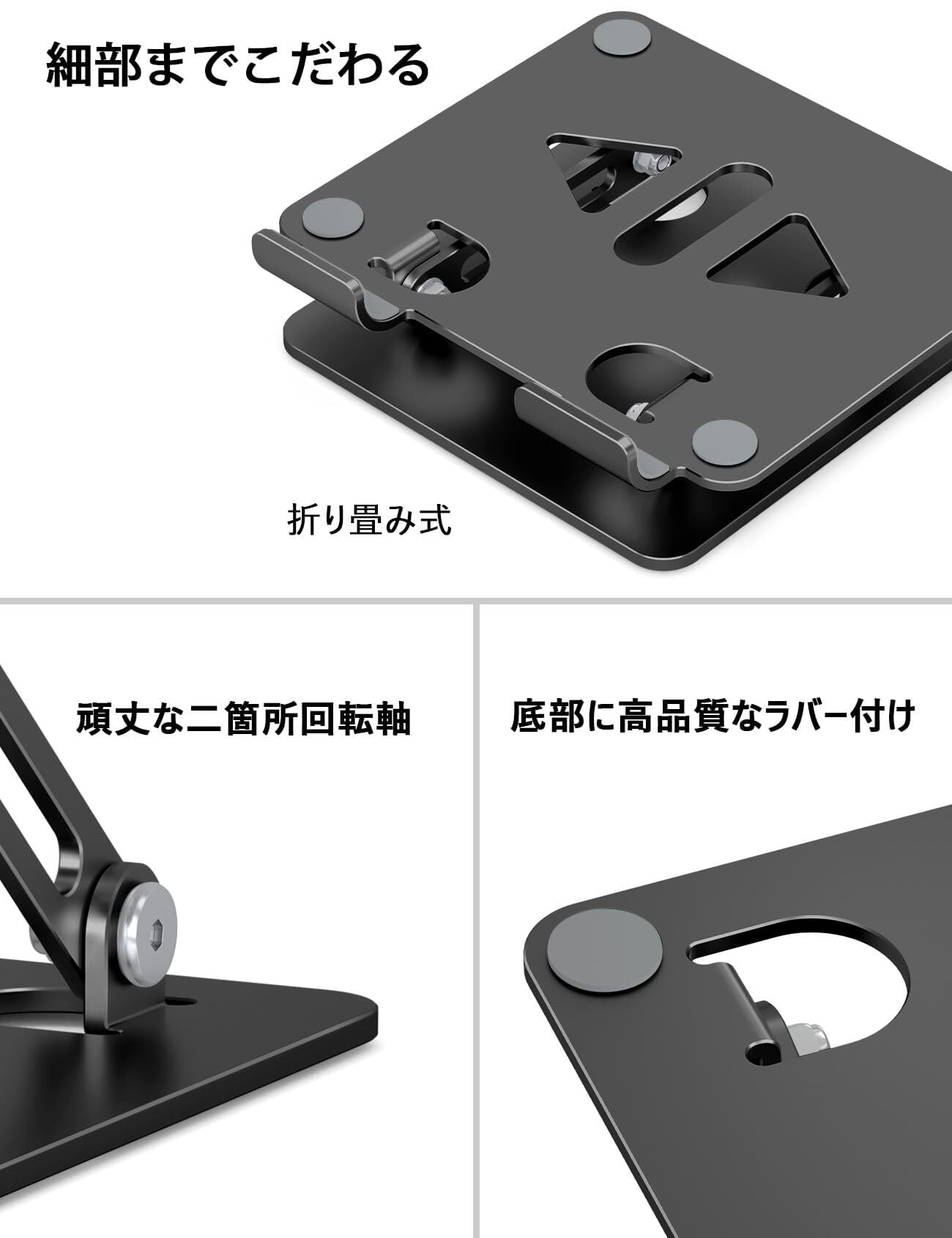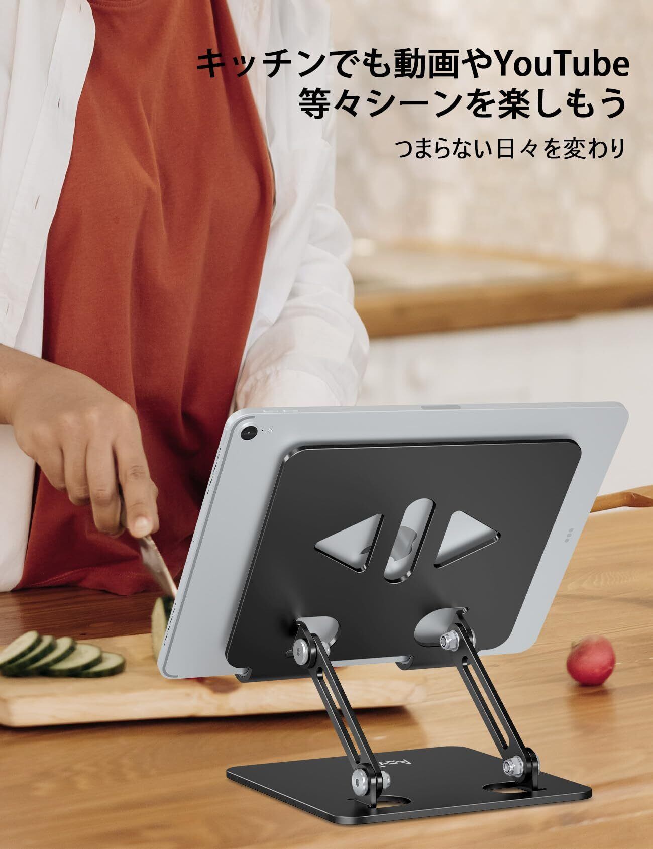 【軽量で持ち運びに便利】 このタブレットスタンドは高品質なアルミニウムを使用しており、わずか262gの軽さで、持ち運びにとても便利です。折りたたむとコンパクトになり、バッグにすっきり収まります。出張や旅行の際にも簡単に持ち運べ、どこでも快適にタブレットを使用できます。スタンドの天面と底面には防滑シリコンパッドがあり、タブレットが滑る心配もありません。また、足部分にもシリコンパッドが付いており、テーブルやタブレットを傷つけることなく、安心に使えます。