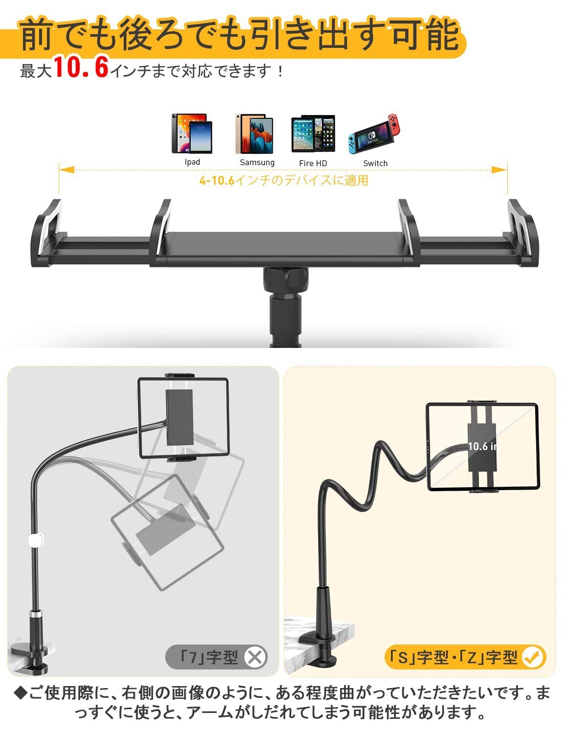【最大10.6インチiPadまで✧多機種兼用】 弊社のタブレットスタンドのクランプは、前のクランプサイズより改善され、クランプが全長19.5cmになり、設備を受ける部分は広くなり、前でも後ろでも引き出す可能になります。最大10.6インチiPadまでを置いても安定しています。スマホをより快適に置くことができ、スマホ/タブレットをクランプに入れも取り出しも簡単です。改善されたスタンドのデザインが4-10.6インチのスマホ&タブレット&任天堂等機種に適用。さらに、ケースを付けている状態も利用可能です。動画鑑賞、ゲームで様々な場合でもっと役立ちます。※指を誤って挟んでしまう可能性があり、お子様だけでは使わせないようにしてください。
