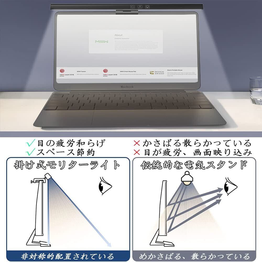 【非対称配光設計】モニターライトは非対称光学設計を採用して、スクリーンからの反射による反射光がゼロになって、見えづらくなりません。照明の角度が調整でき、光が目に入らないような設計になっています。