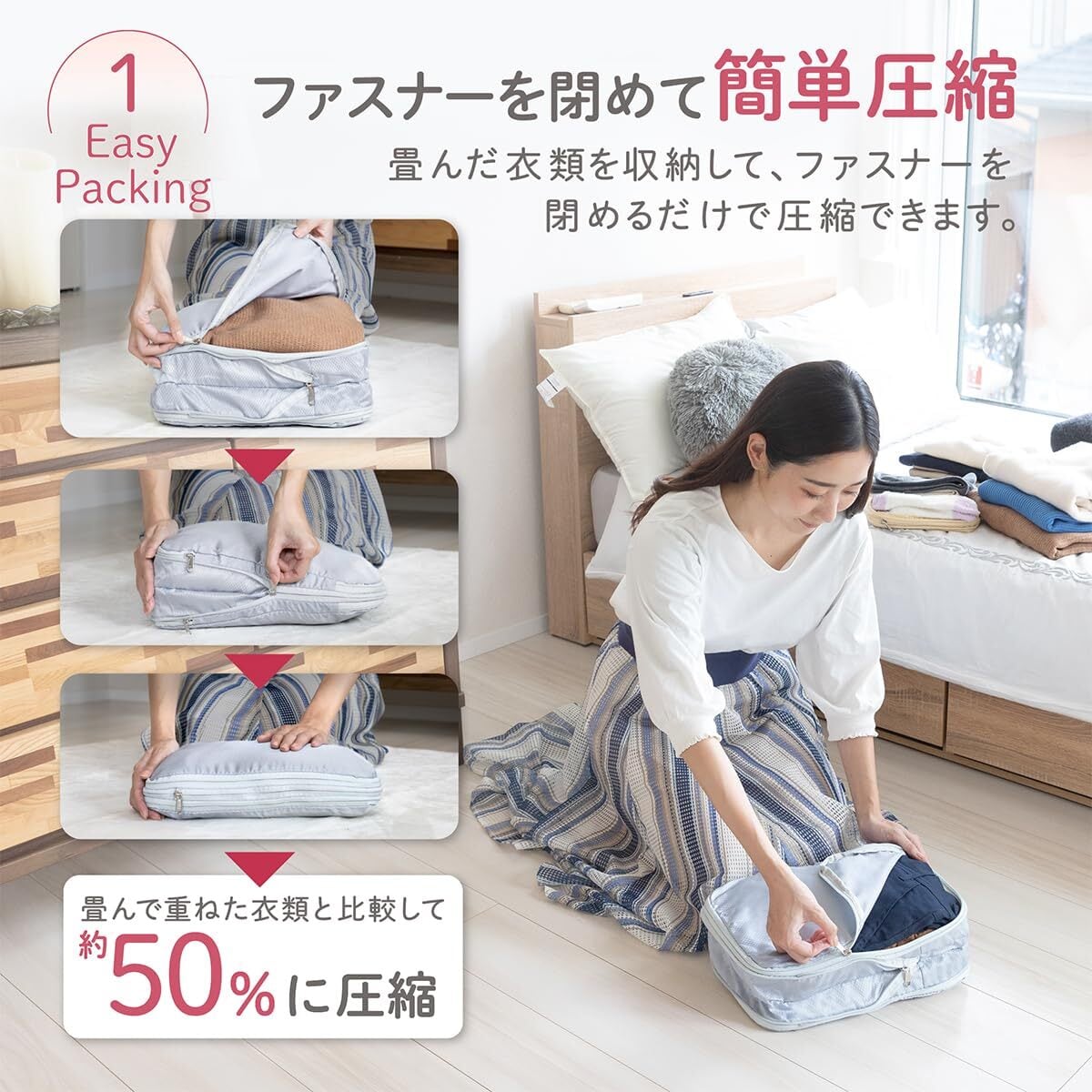 【スマートな収納術】 旅行だけじゃない!日常も快適にする、圧縮ポーチの無限の可能性。スーツケースの中はいつも整理整頓。圧縮ポーチがあれば、かさばる衣類もコンパクトに収納できます。旅行に最適なだけでなく、クローゼットの整理整頓にも役立ちます。両側ポケット付きの圧縮ポーチなら、着用前と後を分けて収納できるから、衛生的に持ち運べます。旅行先での洗濯物も、清潔に保管できます。10色展開の圧縮ポーチなら、あなたのスタイルにぴったりのカラーが見つかります。気分やシーズンに合わせて、使い分けることも可能です。耐久性抜群のナイロン素材を使用しているので、繰り返し使ってもへこたれません。手洗い・丸洗いもできるので、いつでも清潔に保てます。旅行や衣替えはもちろんのこと、日常使いの小物入れや防災グッズとしても活用できます。SS・S・M・Lの4つのサイズと、10色のカラーバリエーションから、用途に合わせて選ぶことができます。