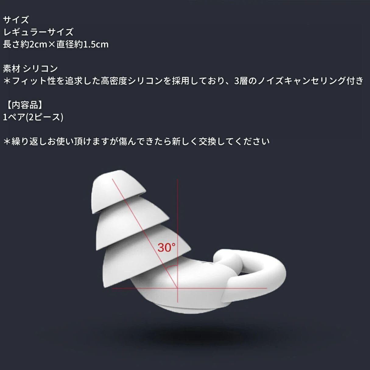 【内容品】 1ペア(2ピース) サイズ レギュラーサイズ 長さ約2cm×直径約1.5cm 素材 シリコン *フィット性を追求した高密度シリコンを採用しており、3層のノイズキャンセリング付き