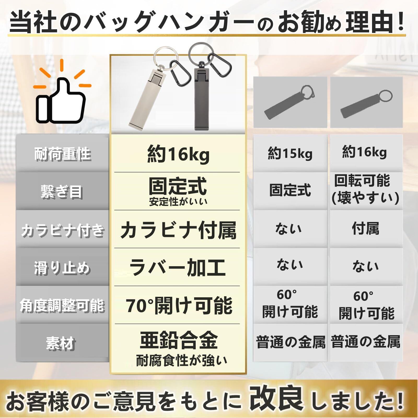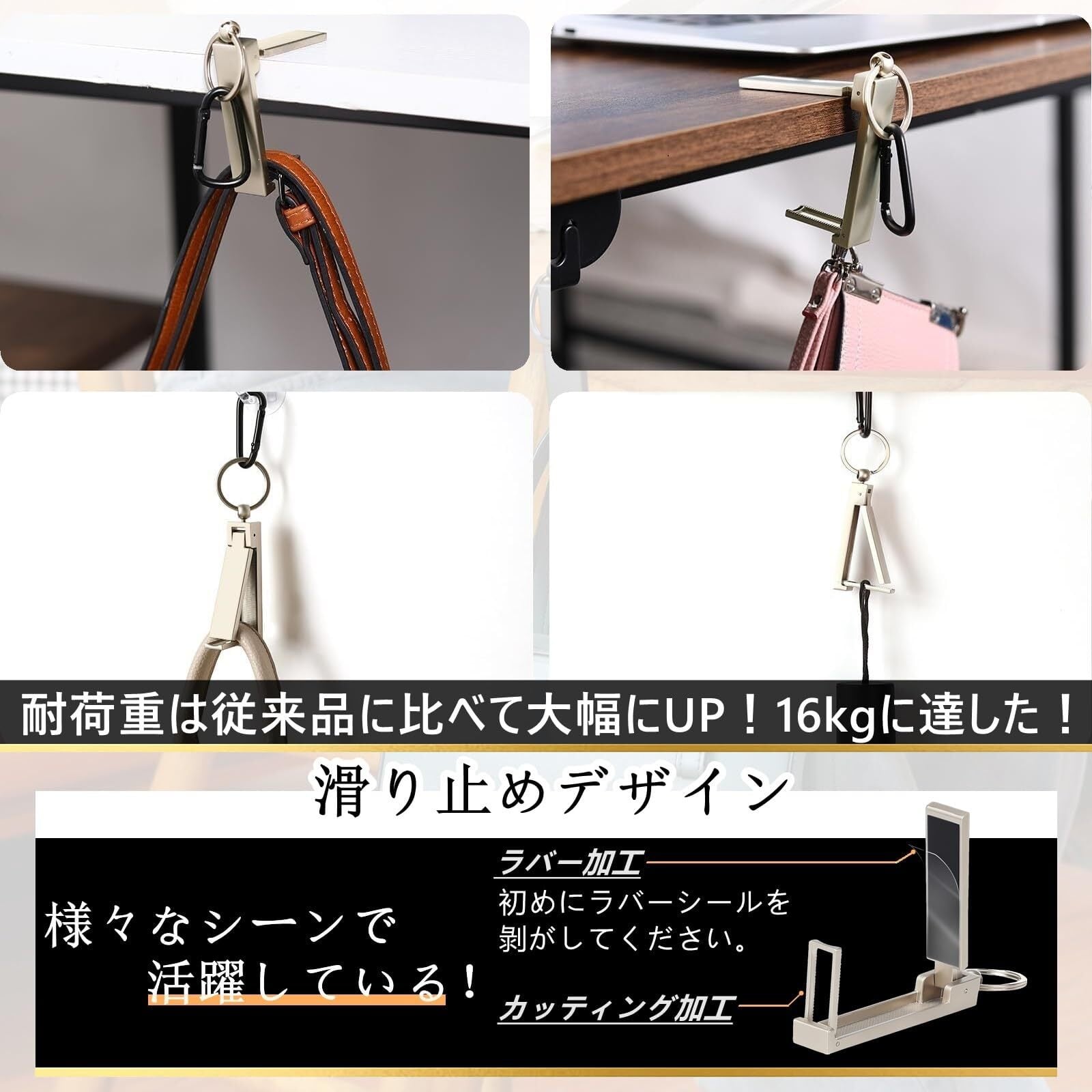 【安定感・滑り止め】バッグ フックの先端には滑り止めのラバーパッドが取り付けられています。(バッグを落としやすい原因は滑りフィルムが付いてました。‼バッグハンガーを使用前に、フィルムを剝がしてください。)これにより、滑りを防ぐだけでなく、家具の表面を摩耗から保護することもできます。さまざまなテーブルエッジ(厚さ4cmまで)に適用。 また、カラビナを使って、吊り下げることも可能です。