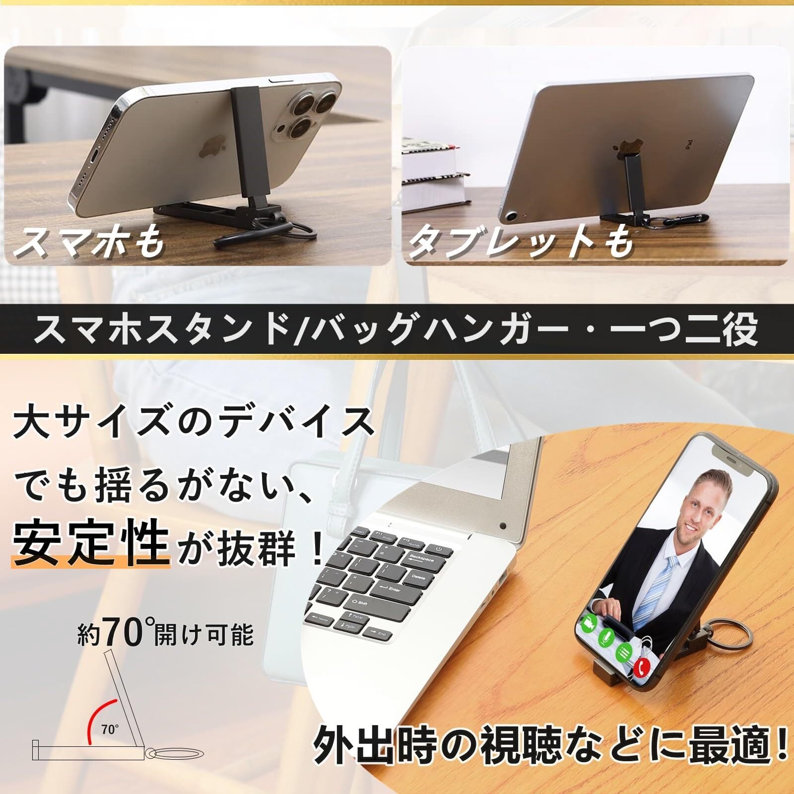 【スマホスタンド機能】ハンガーフックはスマホスタンド機能も付き、動画視聴、読書など楽々に楽しめます。70°以内好きな角度が自由に調節可能。多機能タイプなので、バックハンガー、スマホスタンド、キーホルダーとして多機能に活躍します。【パッケージ内容】フック*1、カラビナ*1。クリスマスプレゼントおすすめ