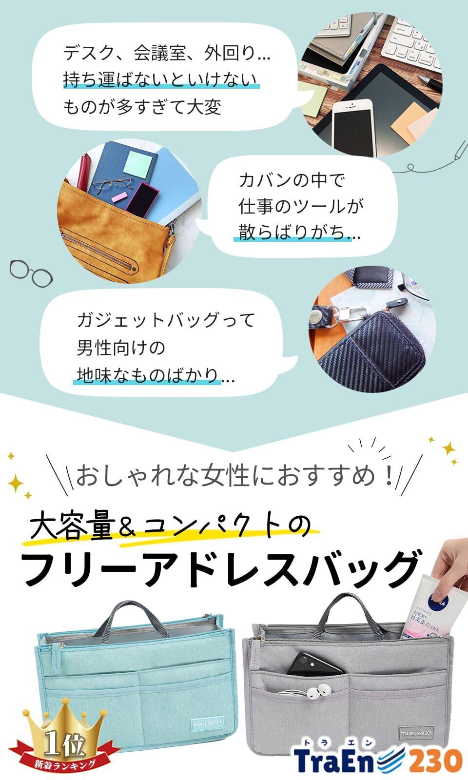 フリーアドレス 便利グッズ バッグインバッグ 小さめ 文具 持ち運び カバン 内ポケット 後付け リモートワーク 便利グッズ (グレー)