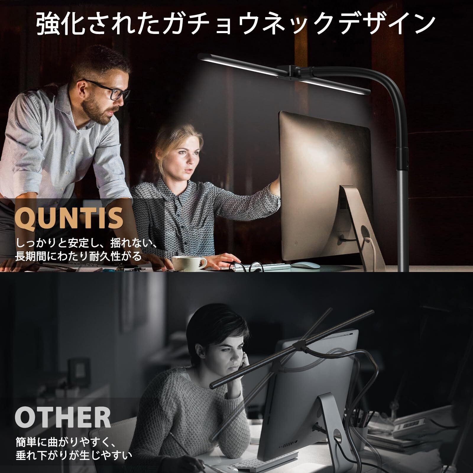【広範囲LEDデスクライト-78cm】 Quntisダブル光源デスクライトは調節可能なガチョウの首とダブル光源設計を採用。完全に広げると78cmの超広範囲な照明が可能で、デスク全体が無影で均一に明るくなる。ライトバーの角度を回転させ、普通のデスクライトを集中のタスクライトに簡単に変え、より明るく、よりターゲット指向の照明を楽しむことができる。大型作業スペース、L型デスク、各種のモニター、曲面ディスプレイに最適。