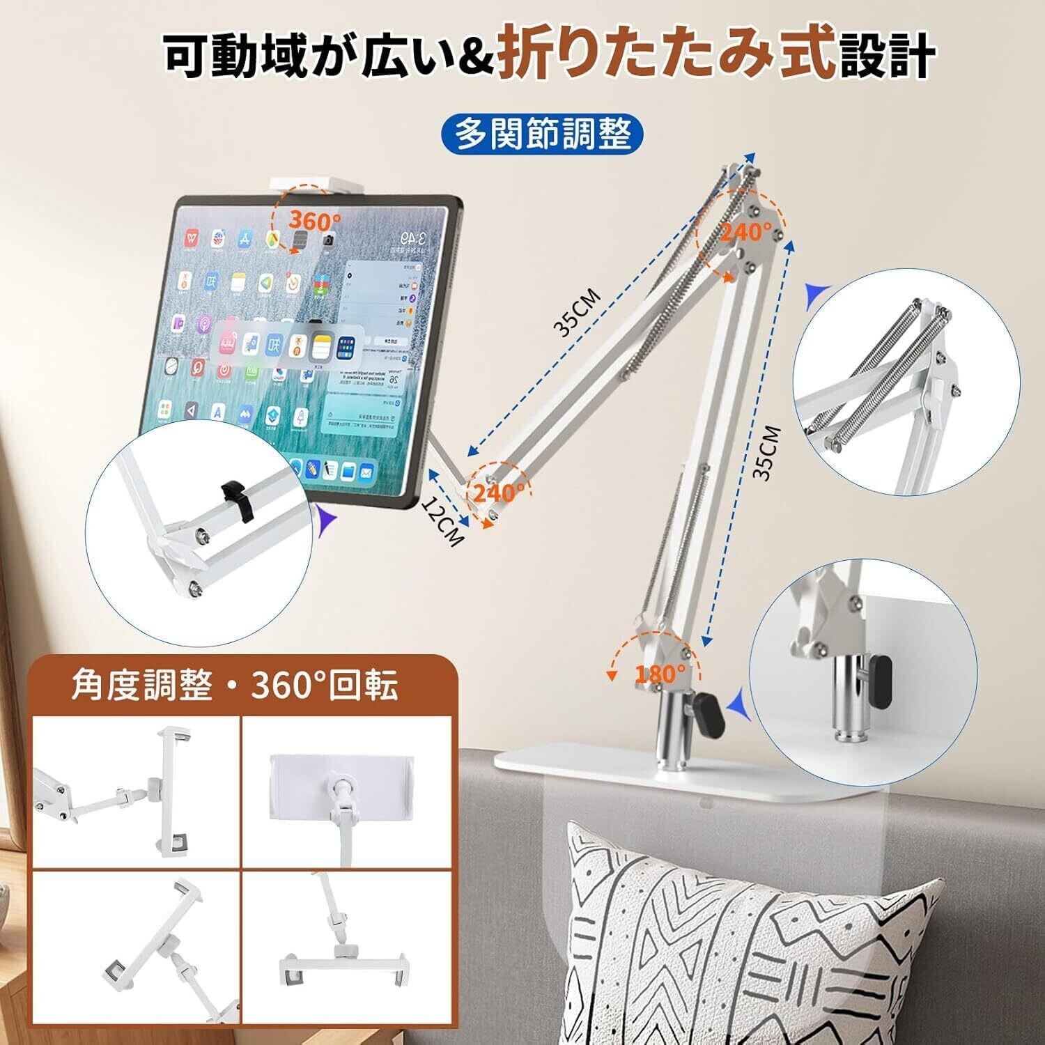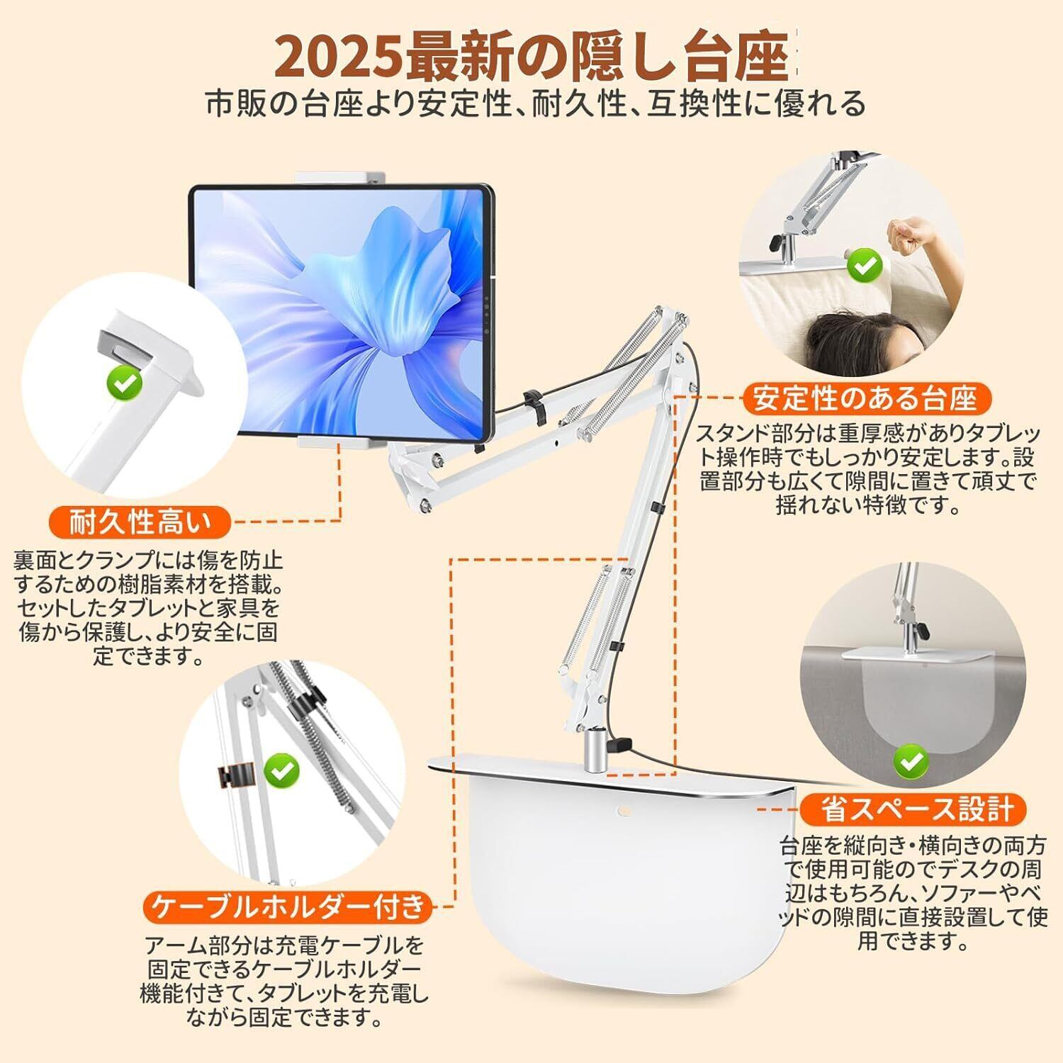 タブレット アーム スマホスタンド 【2025最新型隠し台座・ケーブルホルダー付き】寝ながら ベッドサイド ソファスタンド 隠しベース 折りたたみ式 角度調整可能 ベッド用 360度回転 頑丈 安定 省スペース 持ち運び 横/縱/仰向け 滑り止め ipad アーム スタンド 卓上 テレワーク/オンライン会議&授業/動画視聴 便利 4.5〜12.9インチ ホワイト
