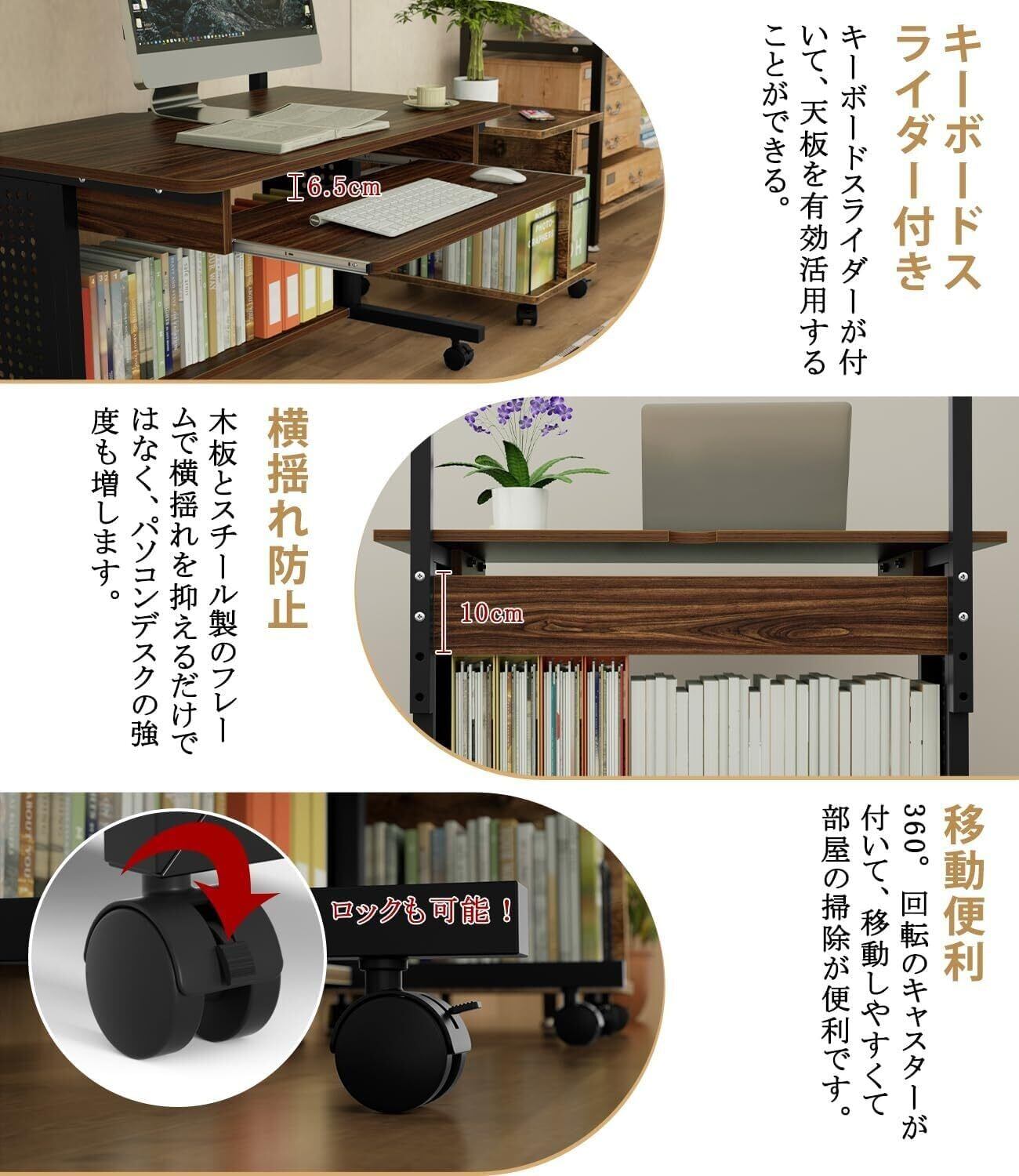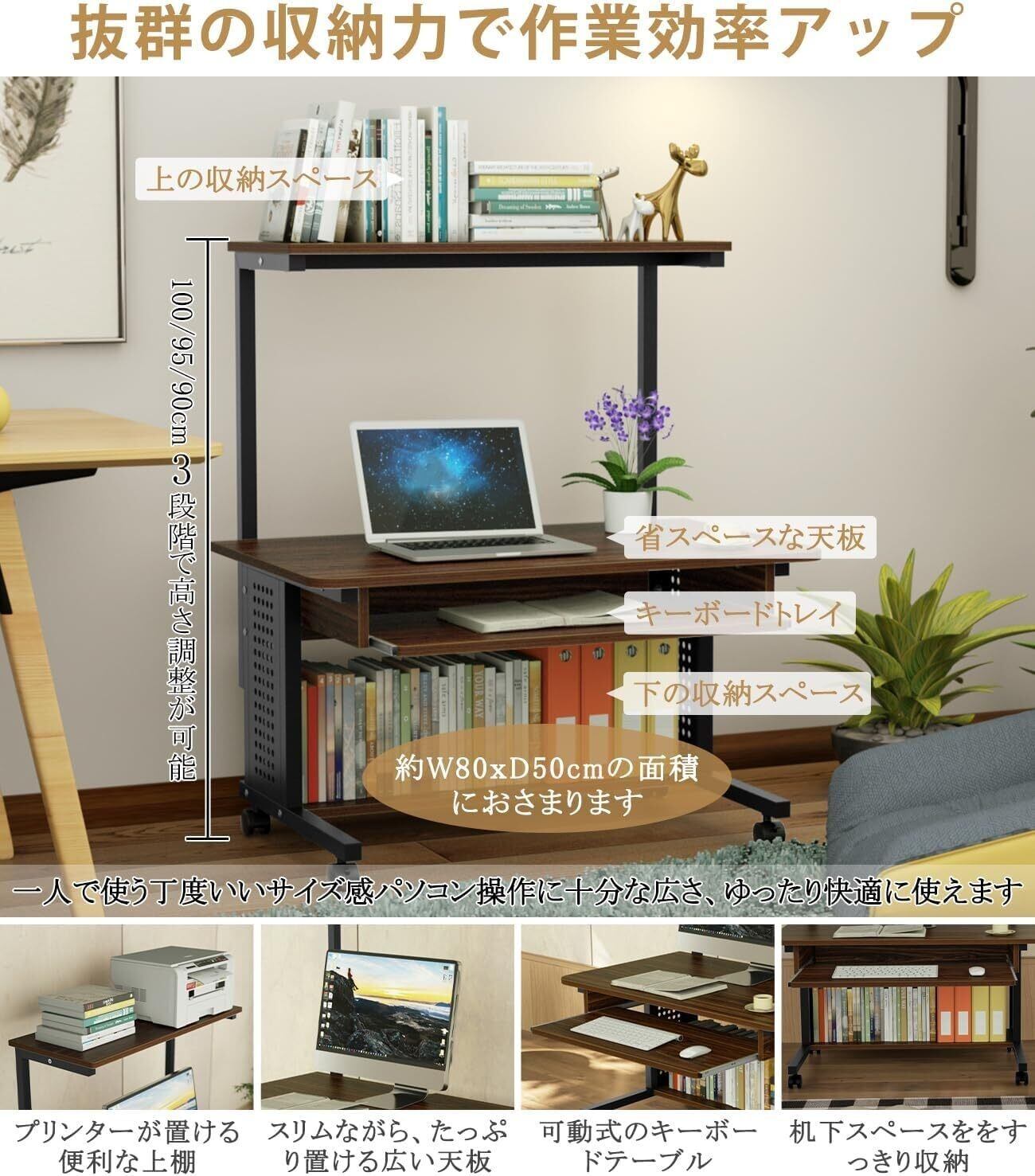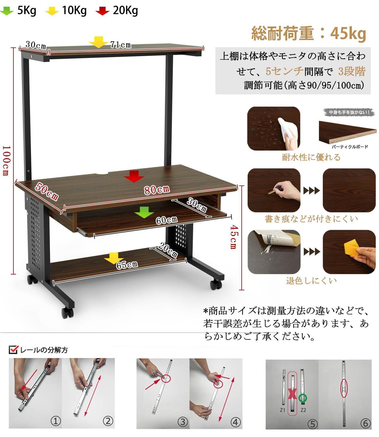 【しっかりした材質】天板・棚板・キーボードスライダー:パーチクルボード(厚さ15mm、メラミン化粧板を採用し、擦り傷防止で耐熱性や耐水性が優れています。吸音性と断熱性と遮音効果も非常に良いです。) 脚部:スチール・粉体塗装(厚さ25mm、粉体塗装加工でペイントよりエコです。臭いがない、色褪せにくいです。) キャスター:プラスチック(360°回転、滑り止め)【仕様】サイズ:80X48X90/95/100cm(天板の高さ:45cm) 総耐荷重:45kg 上棚:10kg 天板:20kg キーボード:5kg 下棚:10kg