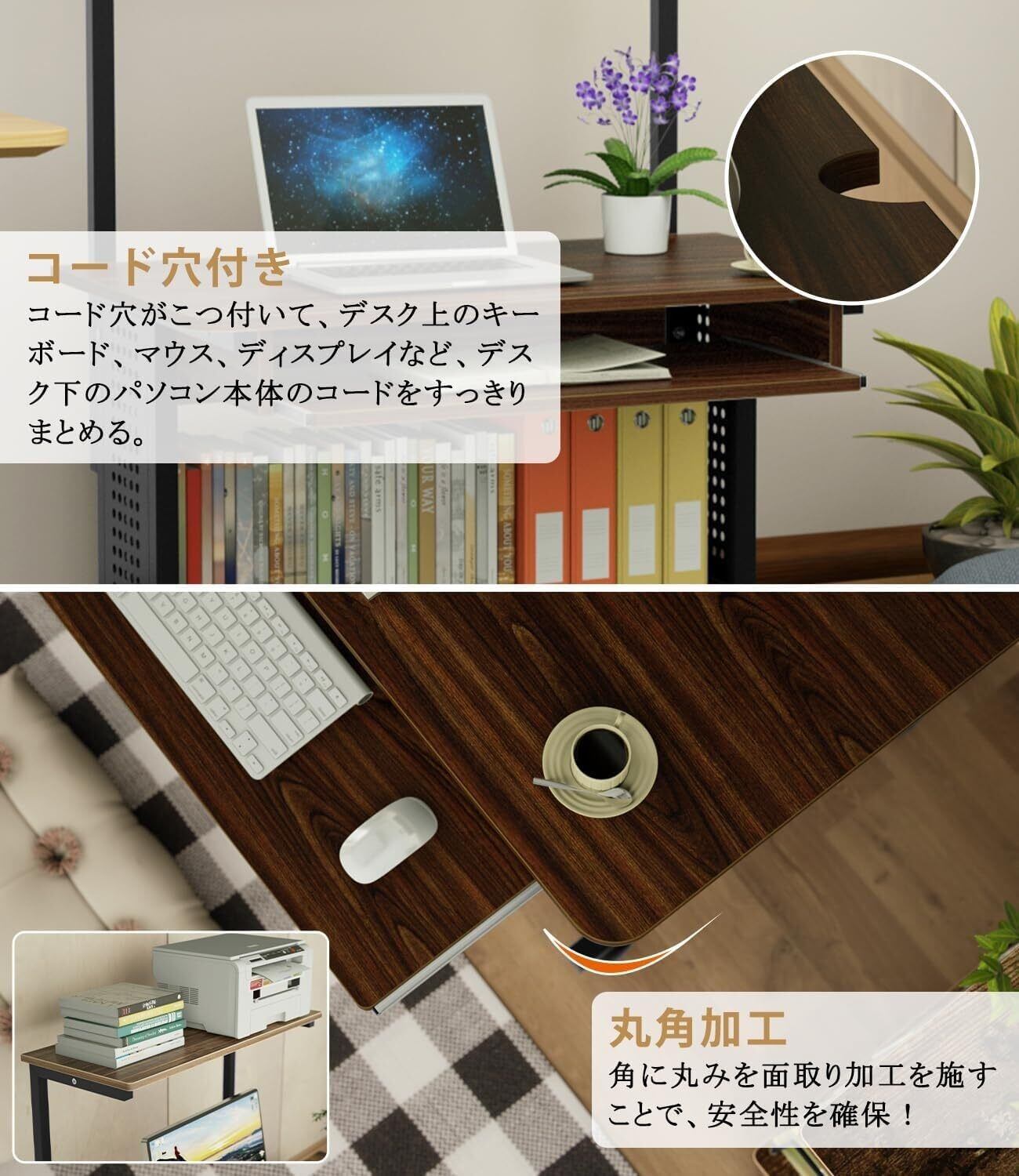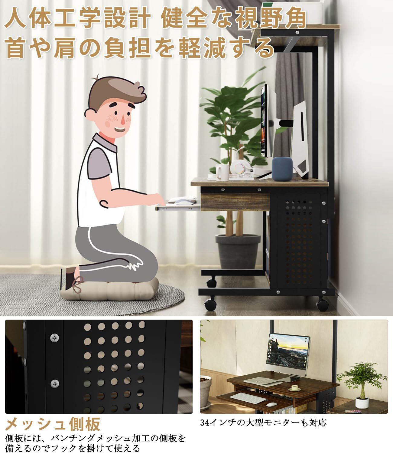【縦の空間を有効活用】①上棚:上棚スペースにはインクジェットプリンタなどのパソコン周辺機器を置くことができます。体格やモニタの高さに合わせて、5センチ間隔で3段階調節可能です。手を伸ばせば使いたいものにすぐ届く便利な上棚です。②天板:パソコン操作に十分な広さ、ゆったり快適に使えます。③下棚:パソコン本体やルーター、書類を収納でき、足元のスペースを有効活用できます。④キーボードスライダー:キーボードや小物を置けます。スリムなのに収納力が抜群で場所が取らないです。ちょっとしたスペースがパソコンコーナーに早変わり、作業効率がぐんぐん上がります。ご自宅ではもちろん、オフィスでも大活躍!
