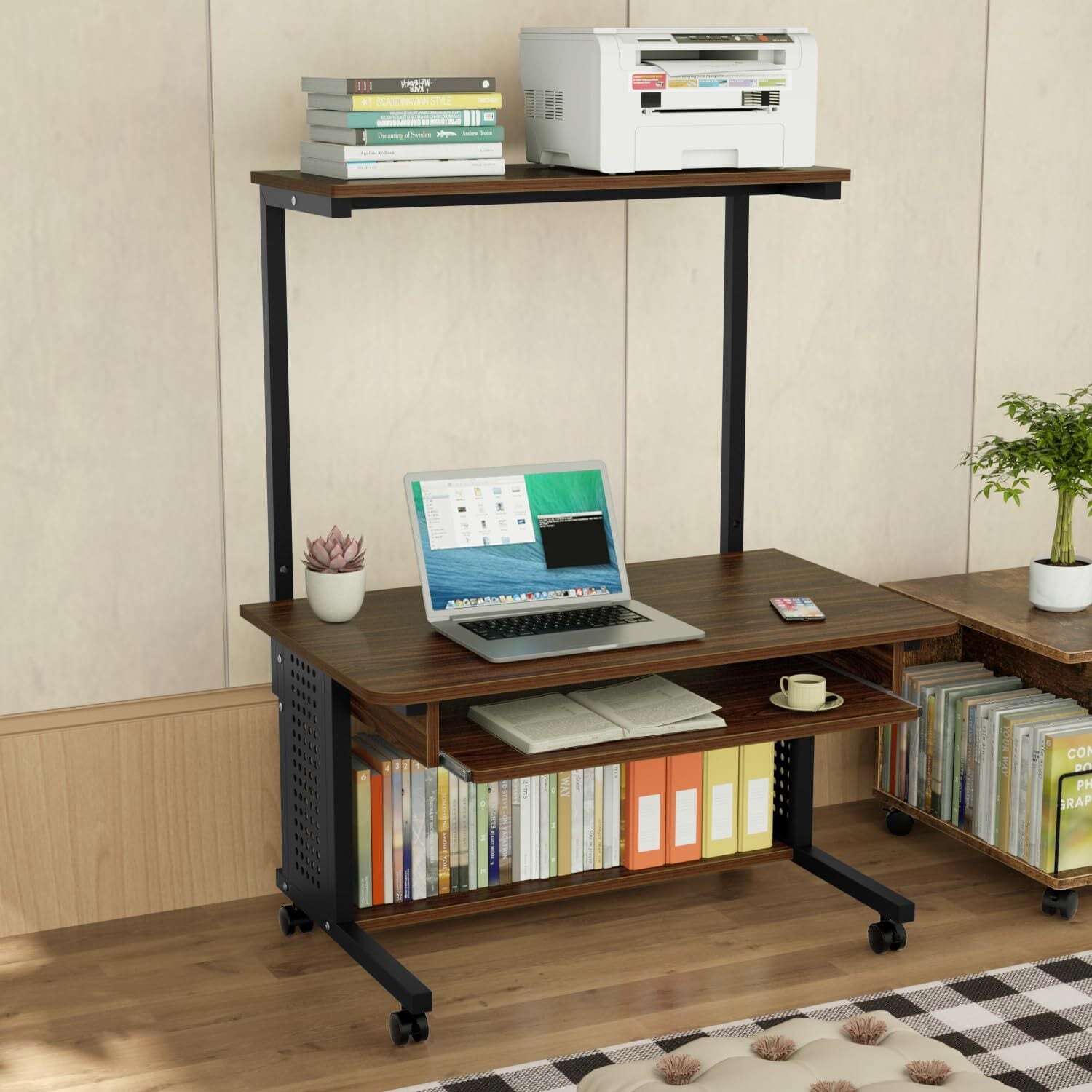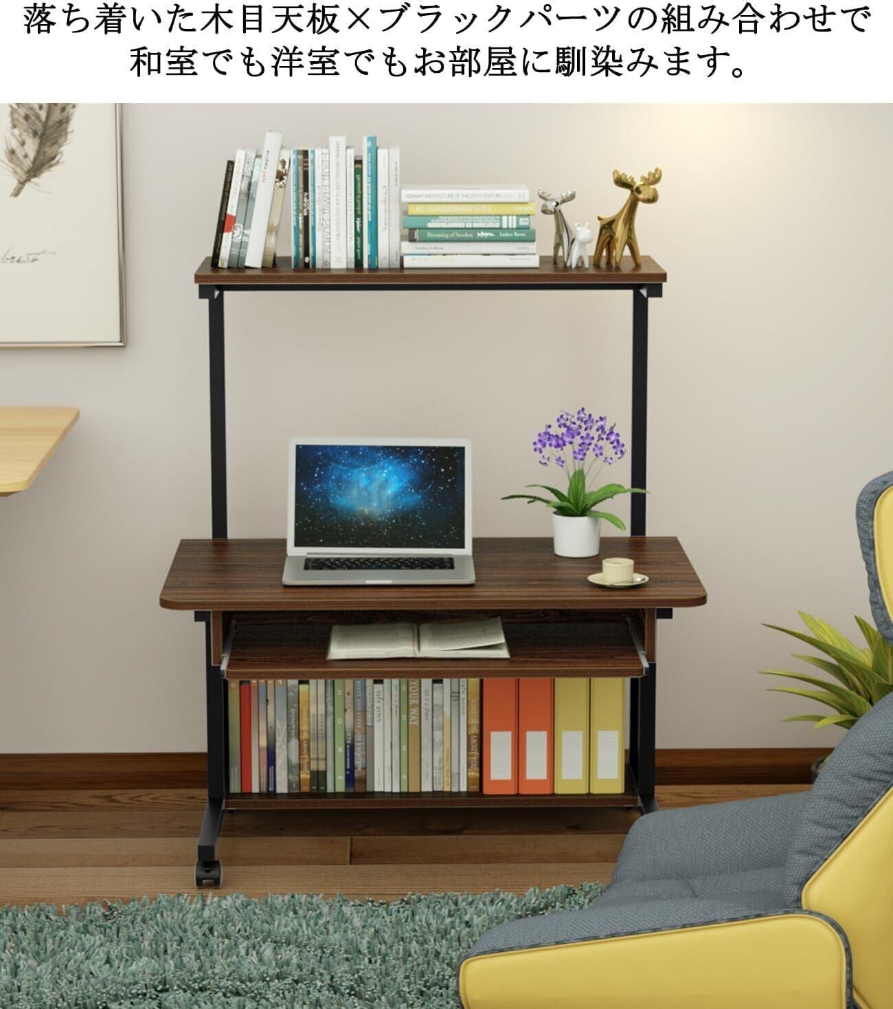 DEWEL ローデスク パソコンデスク ローテーブル 幅80×奥行50cm ロータイプ テレワーク用 机 収納棚付きデスク キーボードテーブル付 パソコンラック プリンターラック 360°回転のキャスター付 ワークデスク 学習机 木製 耐荷重45kg 移動便利 組立簡単 省スペース おしゃれ (ウォールナット)