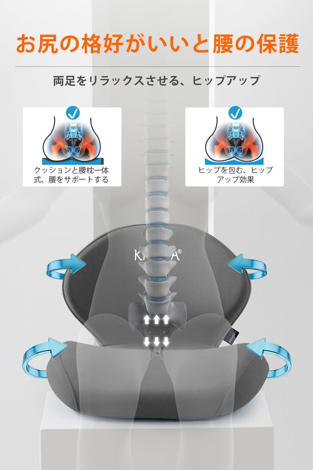椅子 クッション KIYORA 腰痛 クッション 姿勢矯正 痔 座布団 ランバーサポート 一体型 骨盤から腰をサポート 腰の痛みがない 腰椎椎間板ヘルニア予防 腰痛改善 グッズ 車椅子用 アジャスター紐付き 美尻効果 座ぶとん・背あ(一体型-灰色)