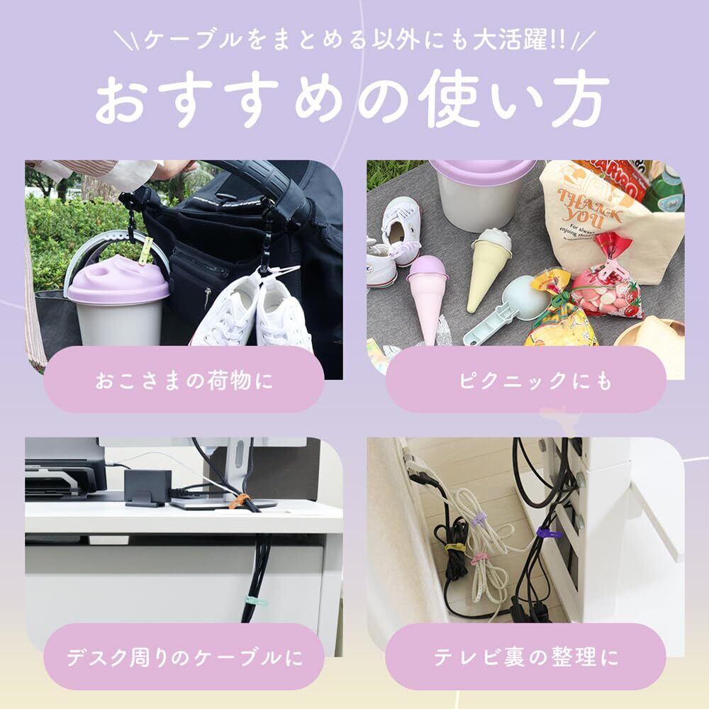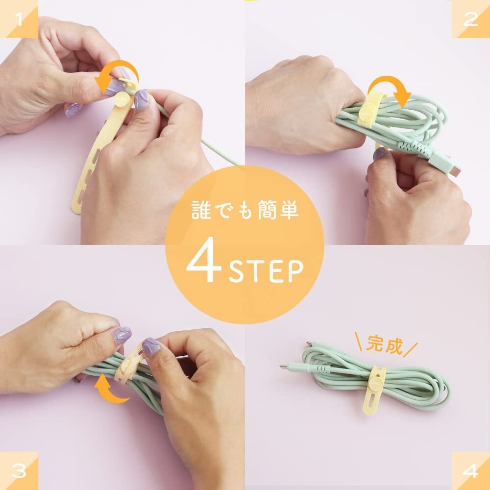 誰でも簡単4STEP:4STEPで、誰でも簡単に留めることができます。 取り外しもストレスなくスムーズに行うことができるので 使いたい場面でにさっと外すことが可能です。 一方の端をケーブルに巻き付けて固定するので、ケーブル使うとき、 持ち運びのときも紛失する心配もありません。