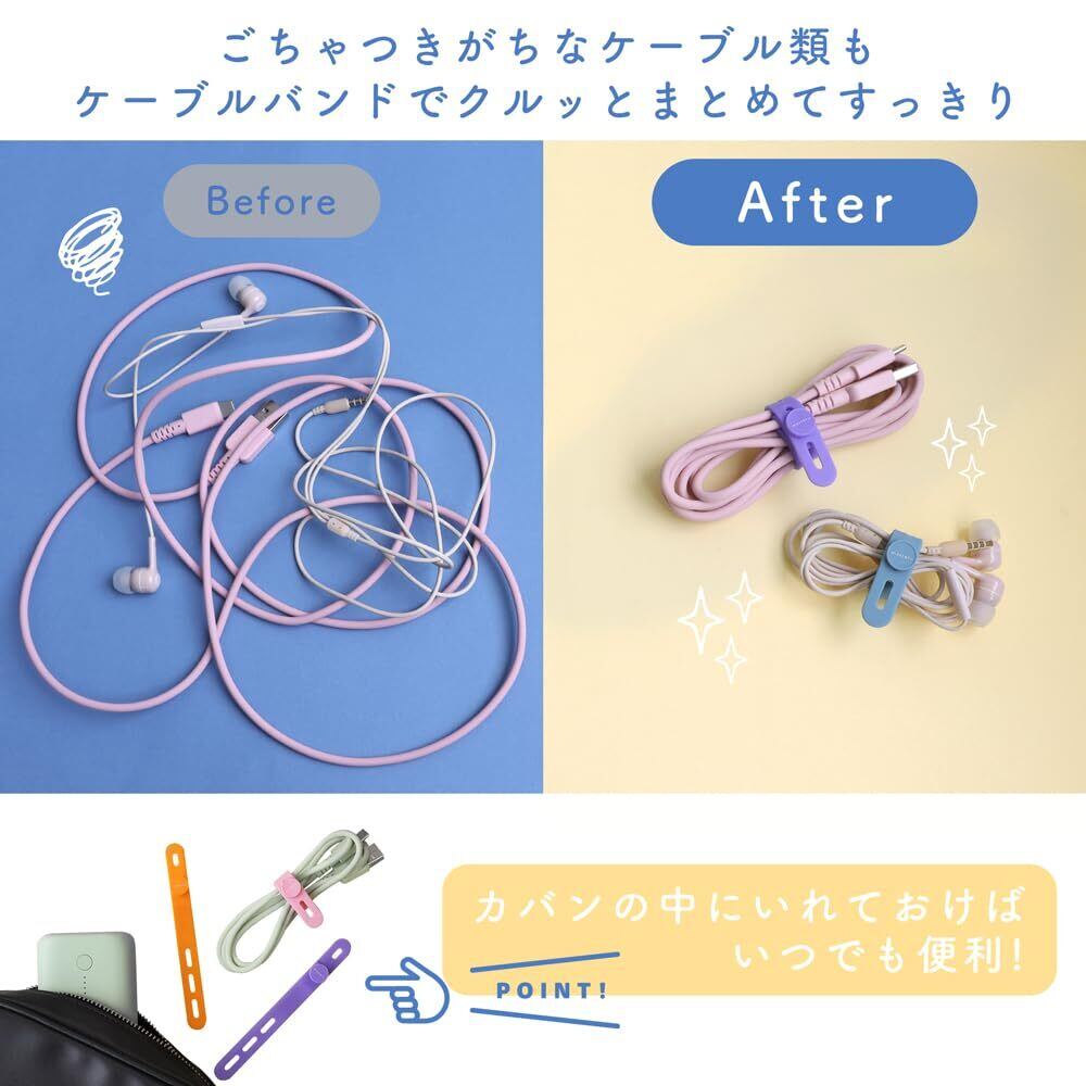 カバンの中にいれておけばいつでも便利にスッキリ:すべすべしっとりとした優しい質感のバンドはボタンのように留められます。 一般的な面ファスナー製のようにバンド同士がくっついたり、ゴミが絡みつくこともありません。 カバンの中にいれておけば、いつでも便利に使うことができます。