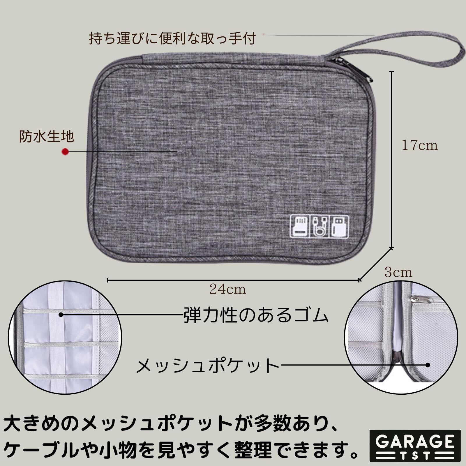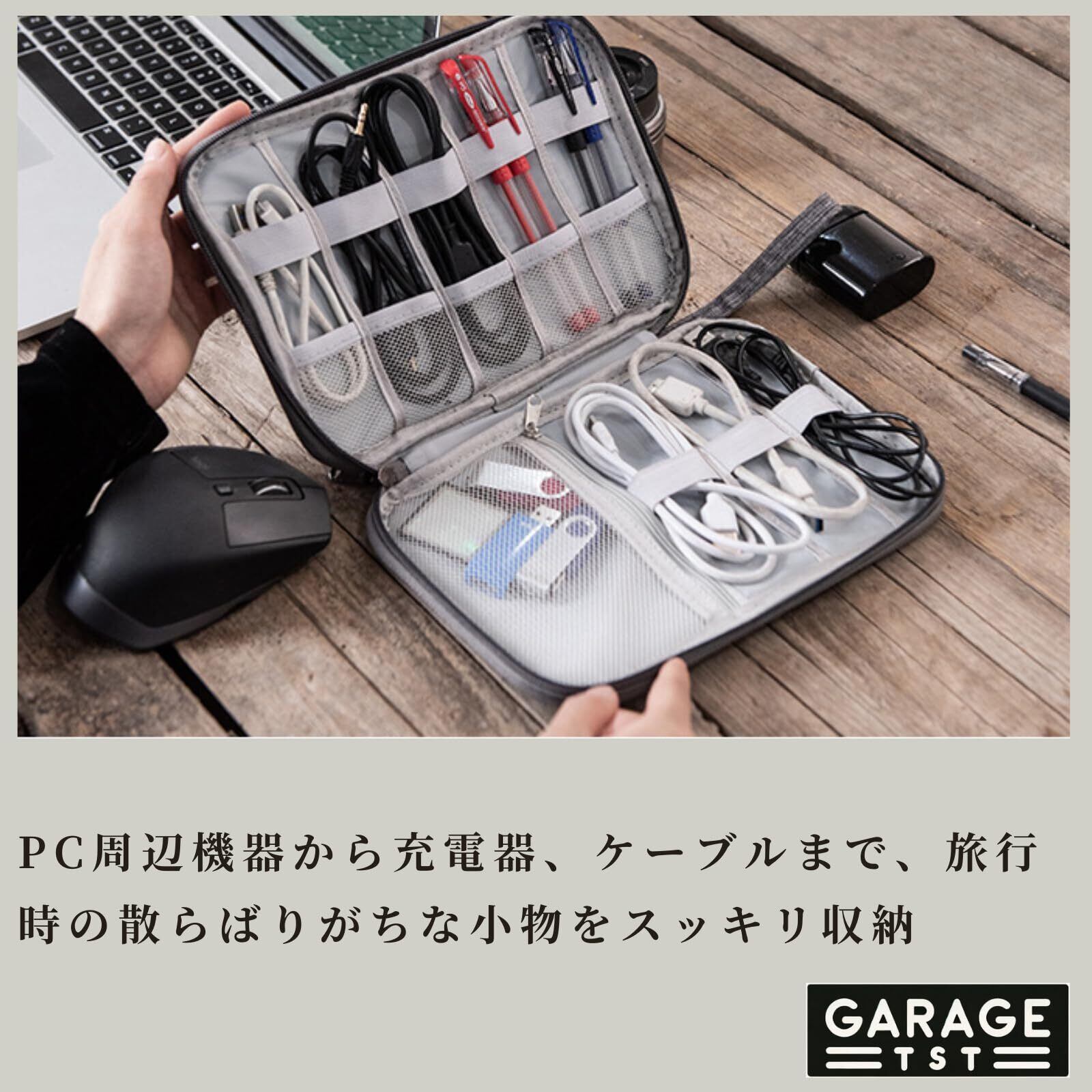 大きめのメッシュポケットが多数あり、ケーブルや小物を見やすく整理できます。
