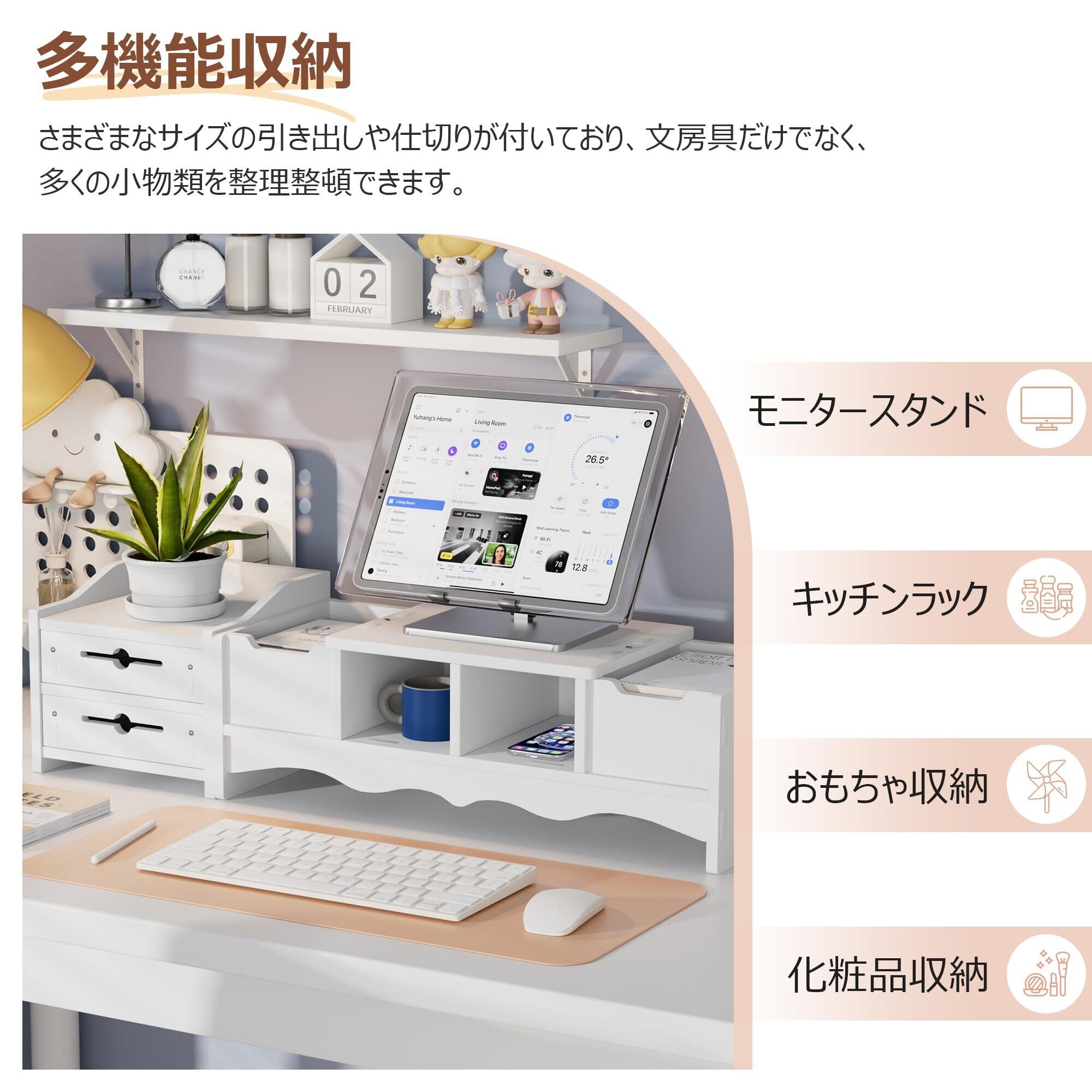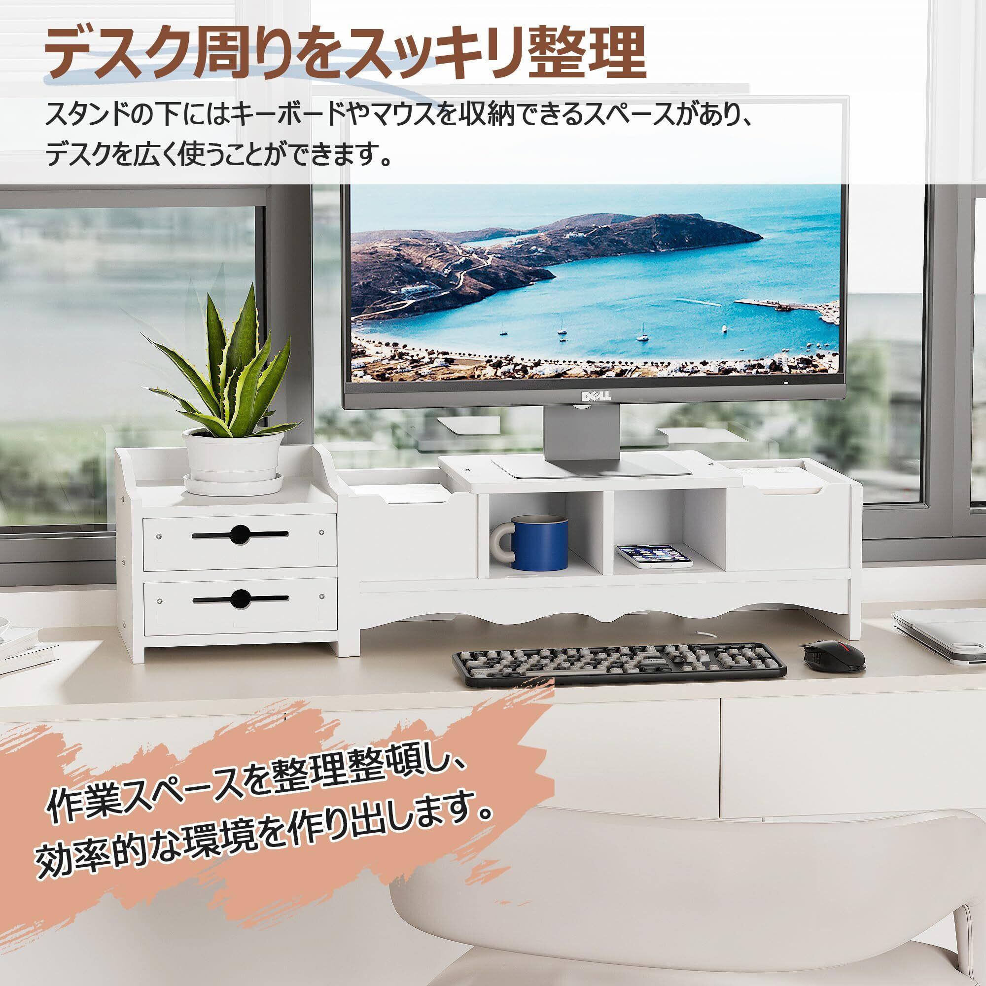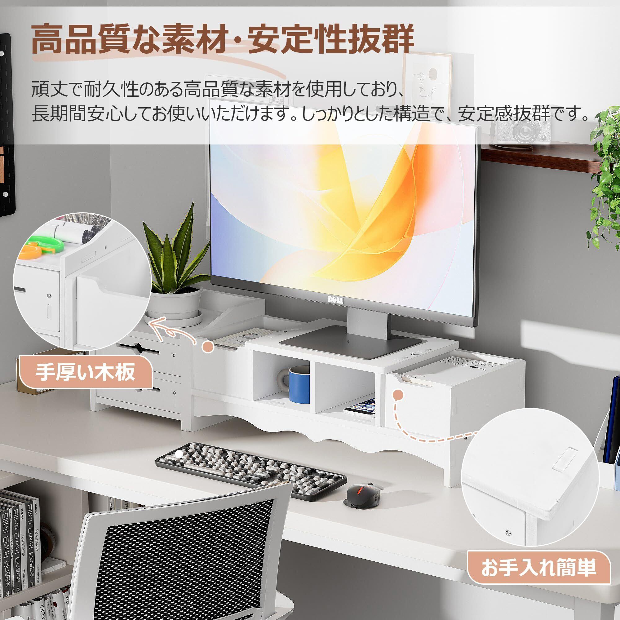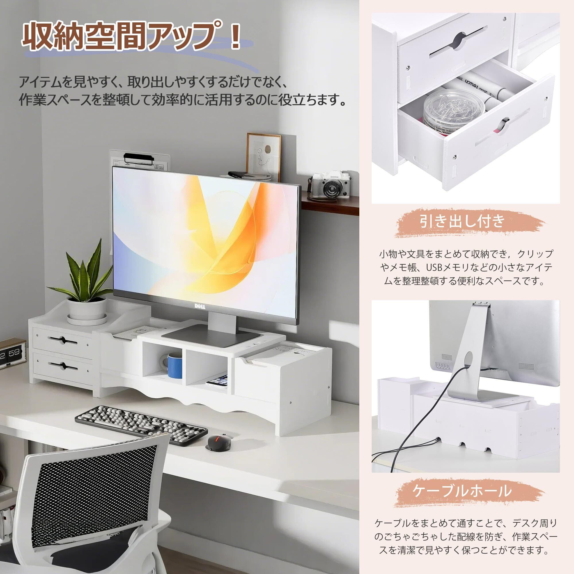 【引き出し付き・収納力抜群】このモニタースタンドは引き出しが付いており、文房具やケーブル、メモ帳などをすっきり収納できます。この卓上収納ラックを使って、デスク周りが整頓され、作業効率が向上します。