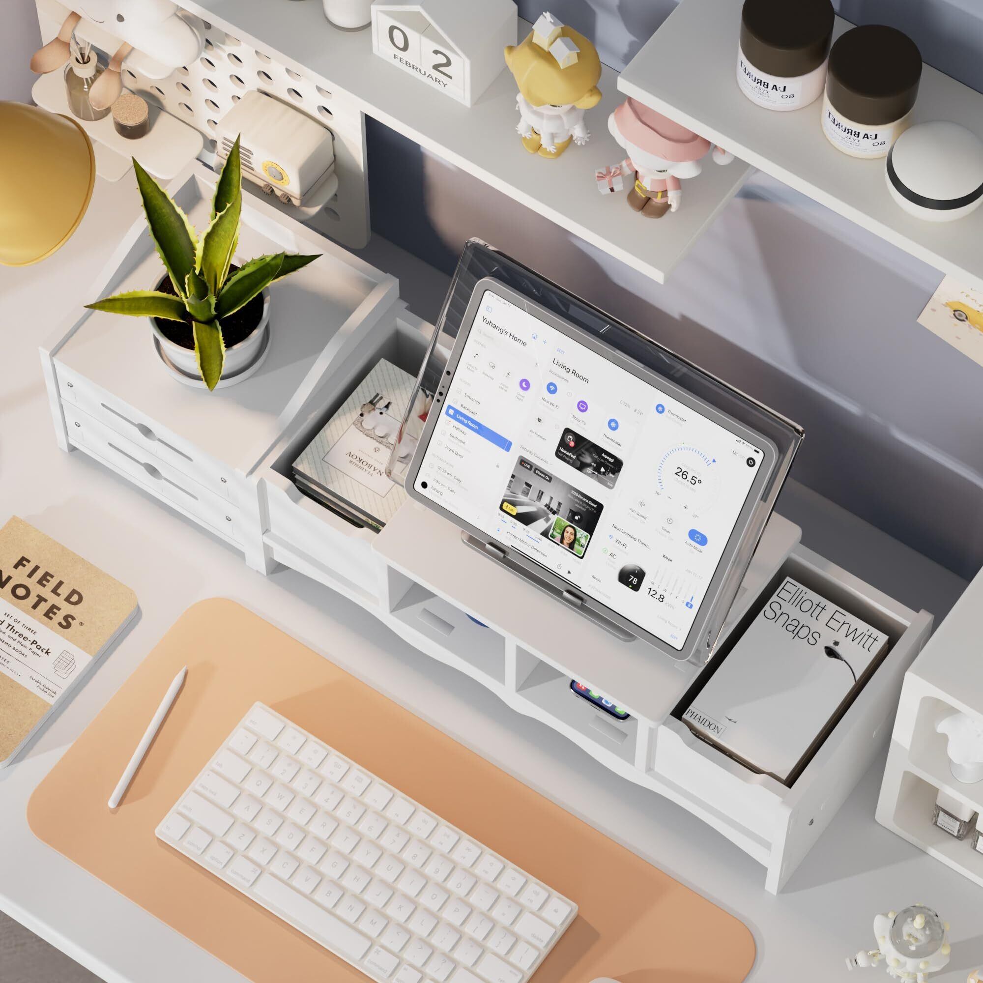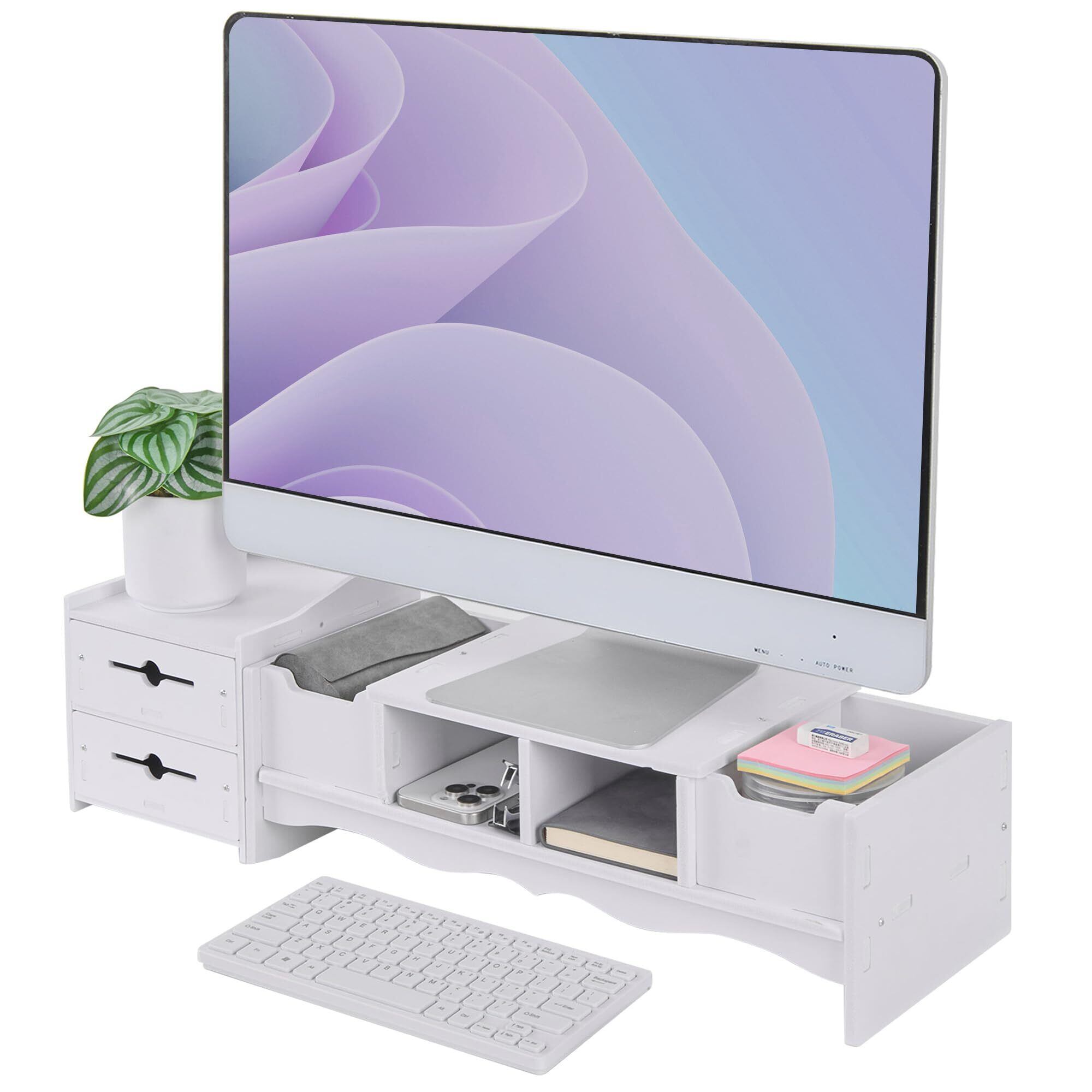 VECELO モニター台 モニタースタンド 幅67×奥行19.5×高さ13cm 仕切り型 省スペース 机上台 引き出し付き 滑り止め 高さ調節可 プリンタ台 キーボード マウス収納 卓上収納 文具収納 組立簡単 整理整頓 テレワーク 在宅勤務 オフィス デスクオーガナイザー デスク上収納