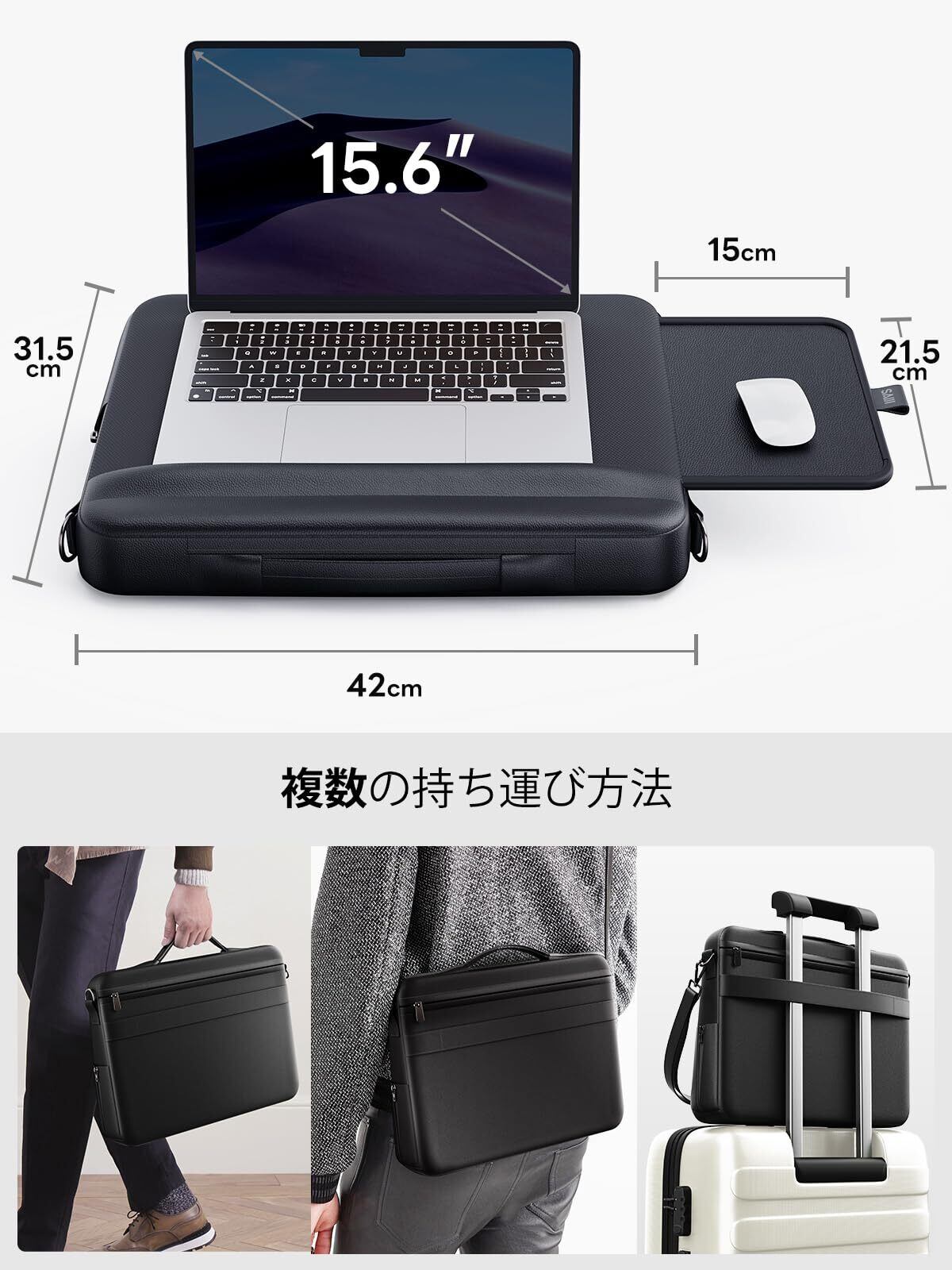 多機能ショルダーバッグ:本製品のサイズは42CM*31.5CMで、15.6インチのノートパソコンを置くことができます。 また、サイドには引き出し式のマウスパッド(15CM*19.6CM)が付いており、ラップデスクとして使用する際にマウスを使用する十分なスペースを確保することができます。 また、ショルダーストラップが付いているので、ショルダーバッグとしても使用できます。