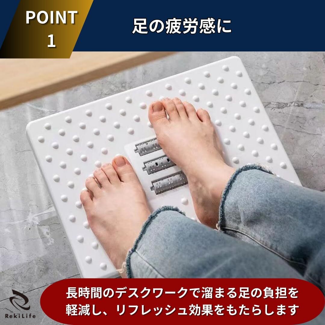 【仕事をしながらフットマッサージ】足を置くだけで自然に足裏を刺激し、むくみやの軽減を促します。長時間の座り仕事で負担がかかりがちな足をしっかりとケア。シンプルなデザインながら、毎日のリラックスタイムをサポートする心地よい使用感が特徴です。