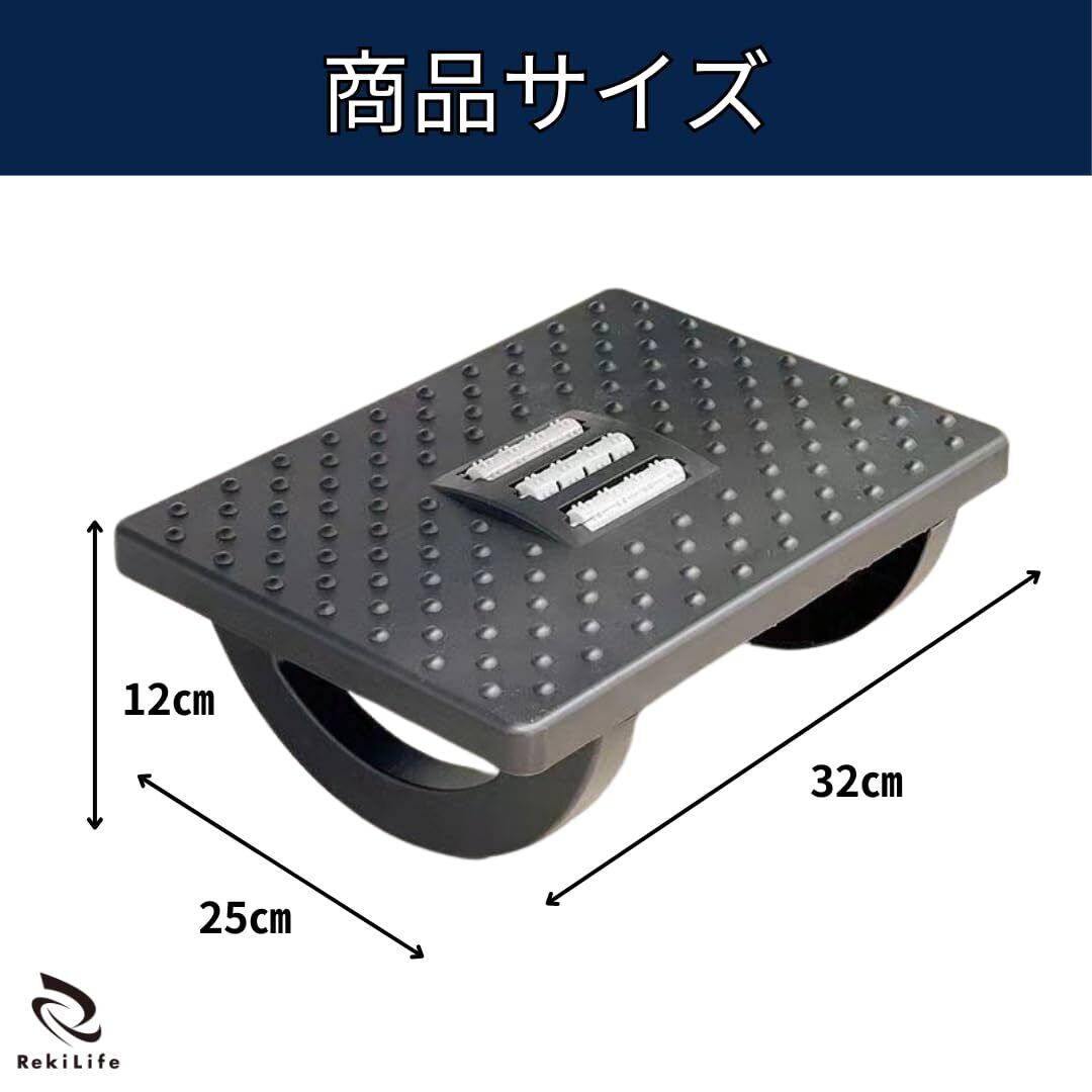 【足の感に】足置きと足つぼローラーが一体となったフットレストで、足の疲れやむくみをしっかりサポート。長時間のデスクワークで溜まる足の負担を軽減し、リフレッシュ効果をもたらします。 【仕事をしながらフットマッサージ】足を置くだけで自然に足裏を刺激し、むくみやの軽減を促します。長時間の座り仕事で負担がかかりがちな足をしっかりとケア。シンプルなデザインながら、毎日のリラックスタイムをサポートする心地よい使用感が特徴です。 【180度揺れる足置き】このフットレストは、180°スイングの足置きで、足を動かすことで血行を促進し、自然なマッサージ効果が得られます。オフィスや家庭で座りながらリラックスでき、長時間の使用でも快適です。また滑り止め設計でしっかりと安定して使用できます。