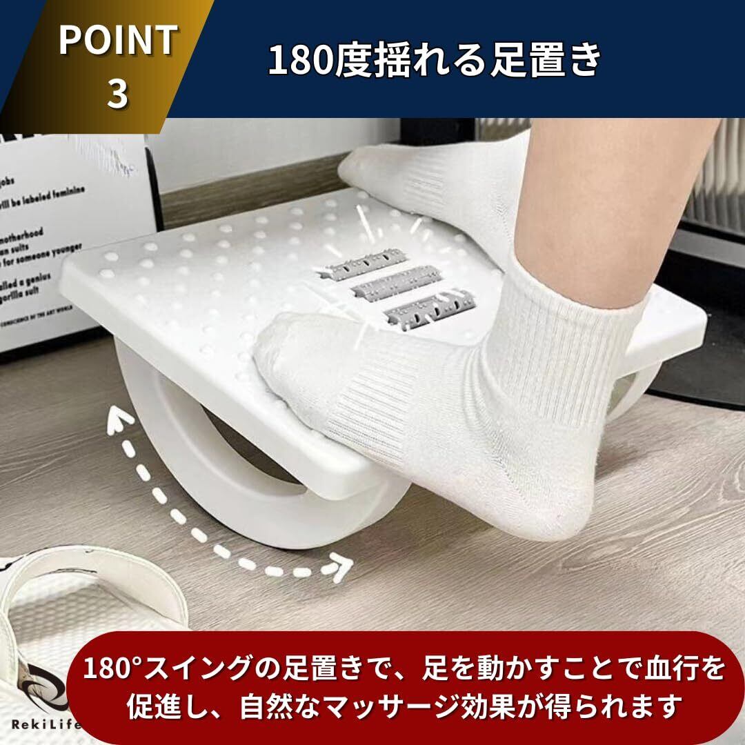 【180度揺れる足置き】このフットレストは、180°スイングの足置きで、足を動かすことで血行を促進し、自然なマッサージ効果が得られます。オフィスや家庭で座りながらリラックスでき、長時間の使用でも快適です。また滑り止め設計でしっかりと安定して使用できます。