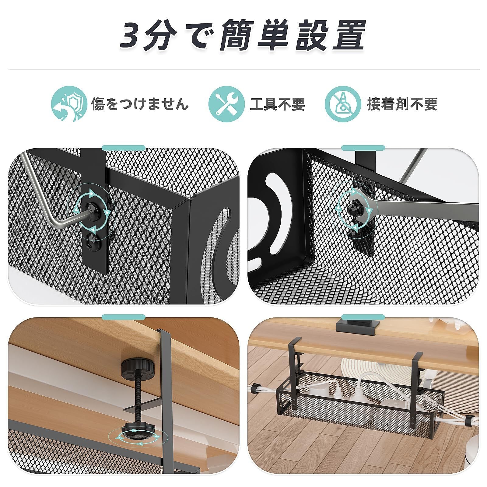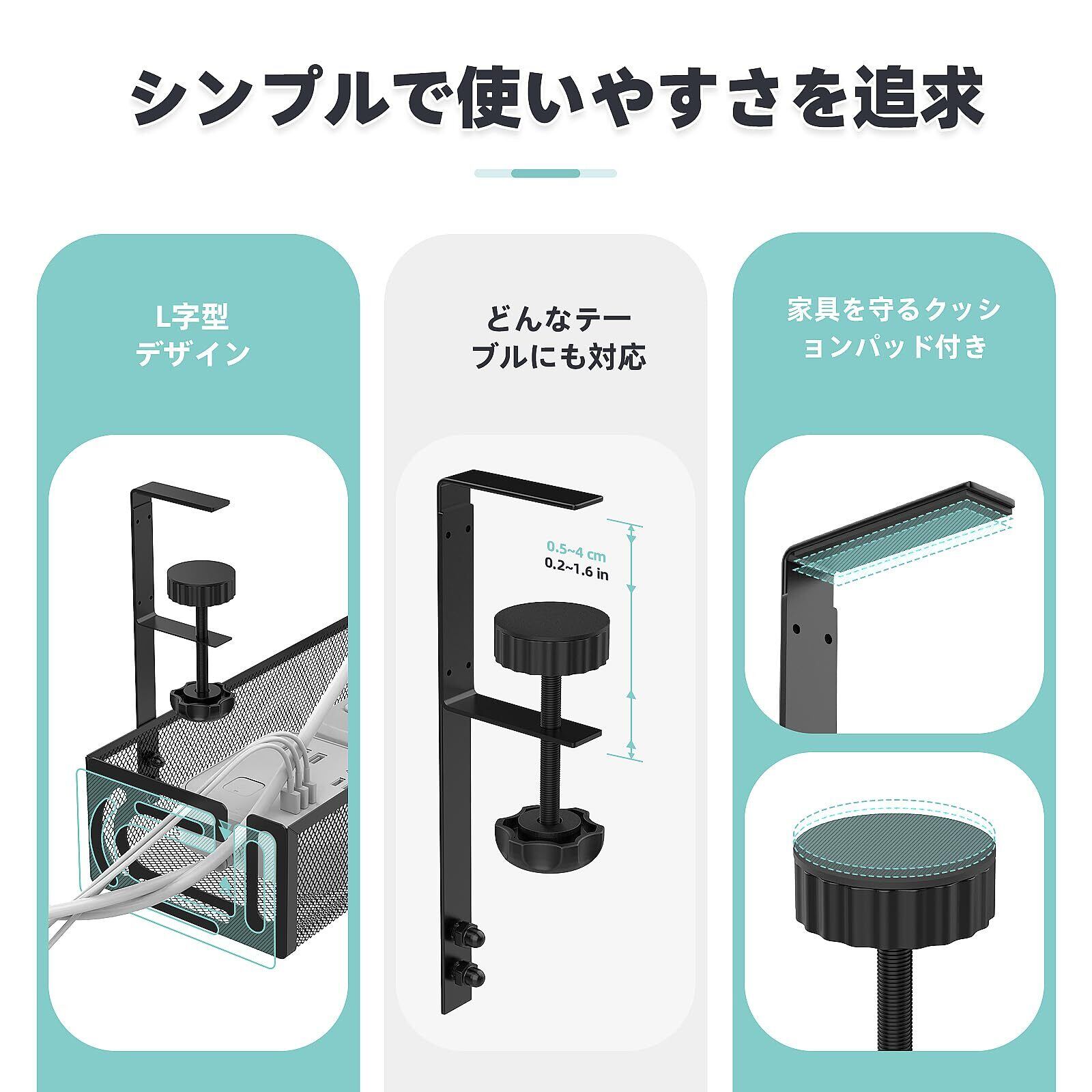 【ドリルレス取付】ネジや接着剤は必要ありません。私たちの卓下ケーブル管理設計は、テーブルフレーム(厚さ0.4~2.2インチ)に直接挟むために設計されています。黒いつまみを手動で回転させるだけで、ケーブルラックをテーブルにしっかり挟むことができ、テーブルを壊したり痕跡を残すことがなく、必要に応じて簡単に位置を変更することができます。