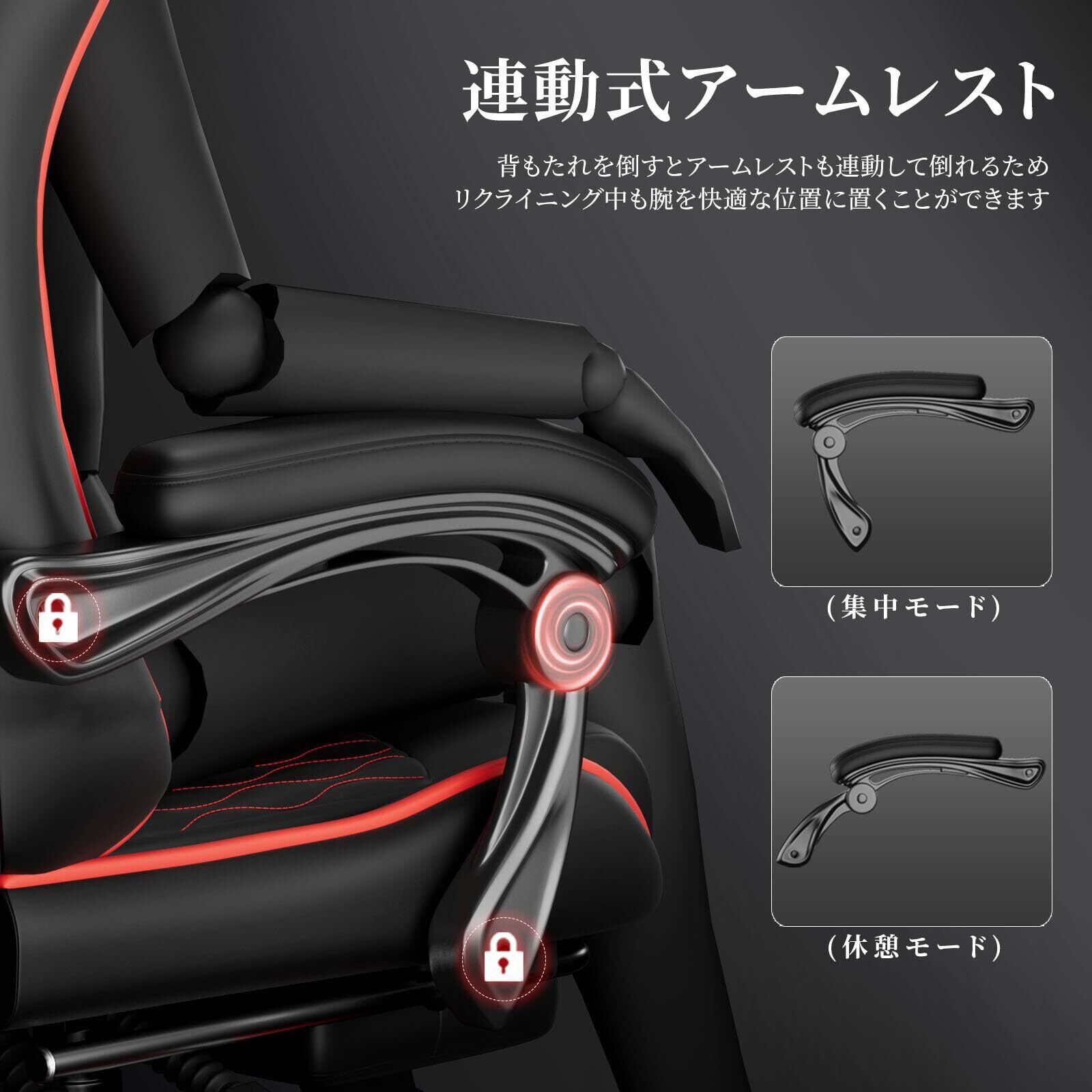 【寝ながらゲームプレイ】チェアに145°リクライニング機能付き、プレイ中に仰向けになったり休憩をとるのに便利です。昼休みにゆっくりと昼寝をすることがでます。また、連動型アームレストでリクライニング時に両手も自然な姿勢でリラックスできます。