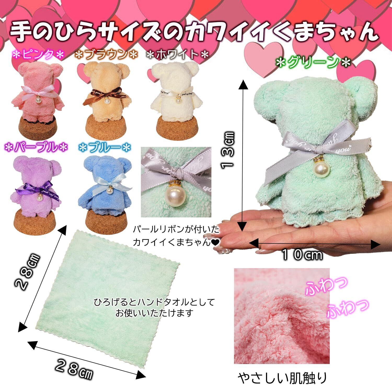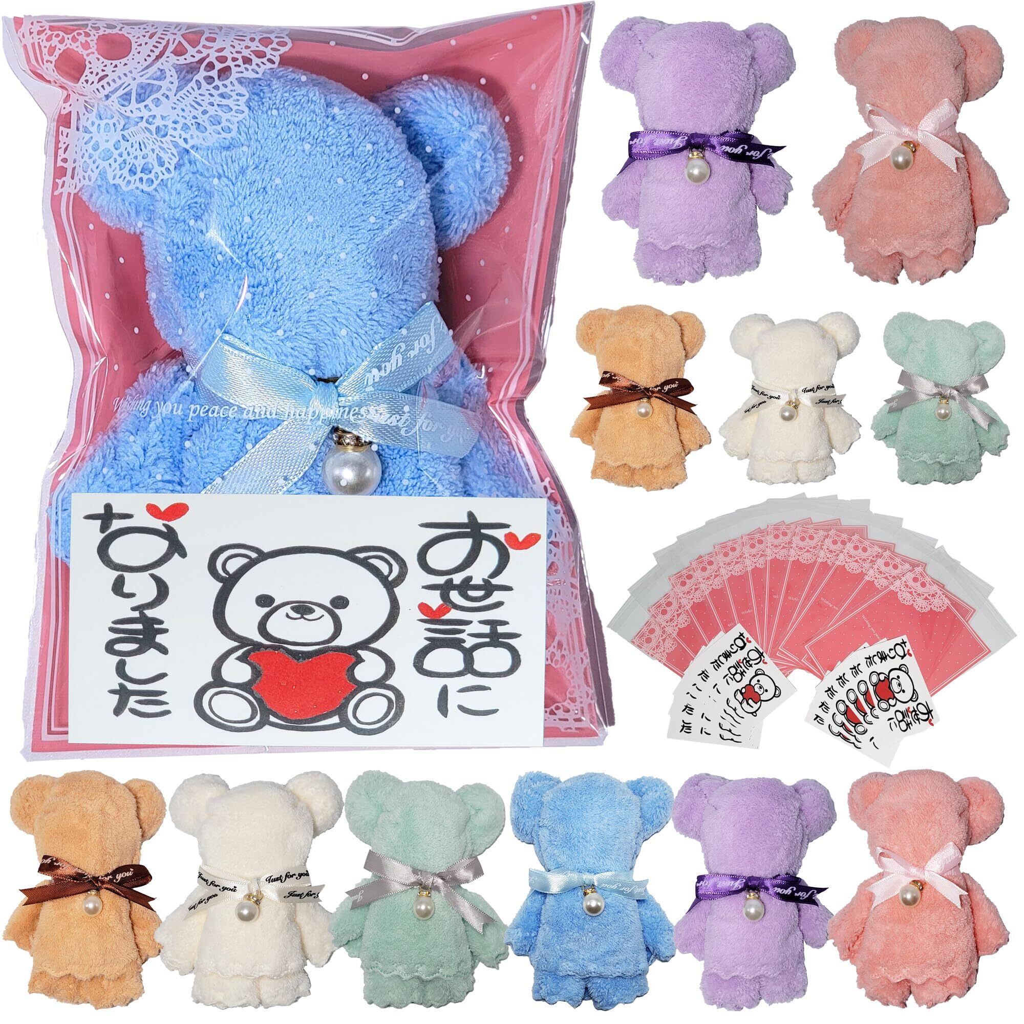 【内容量】 ・Bearタオル 6色×2 計12個 サイズ13㎝×10cm 素材 ポリエステル ・ラッピング袋 1色×12 計12枚 サイズ16㎝×12cm ・メッセージカード 2種×6 計12枚 サイズ9㎝×5.5cm 【梱包サイズ】 幅31cm×奥行23cm×高さ5cm 【総重量】 全体重さ360g