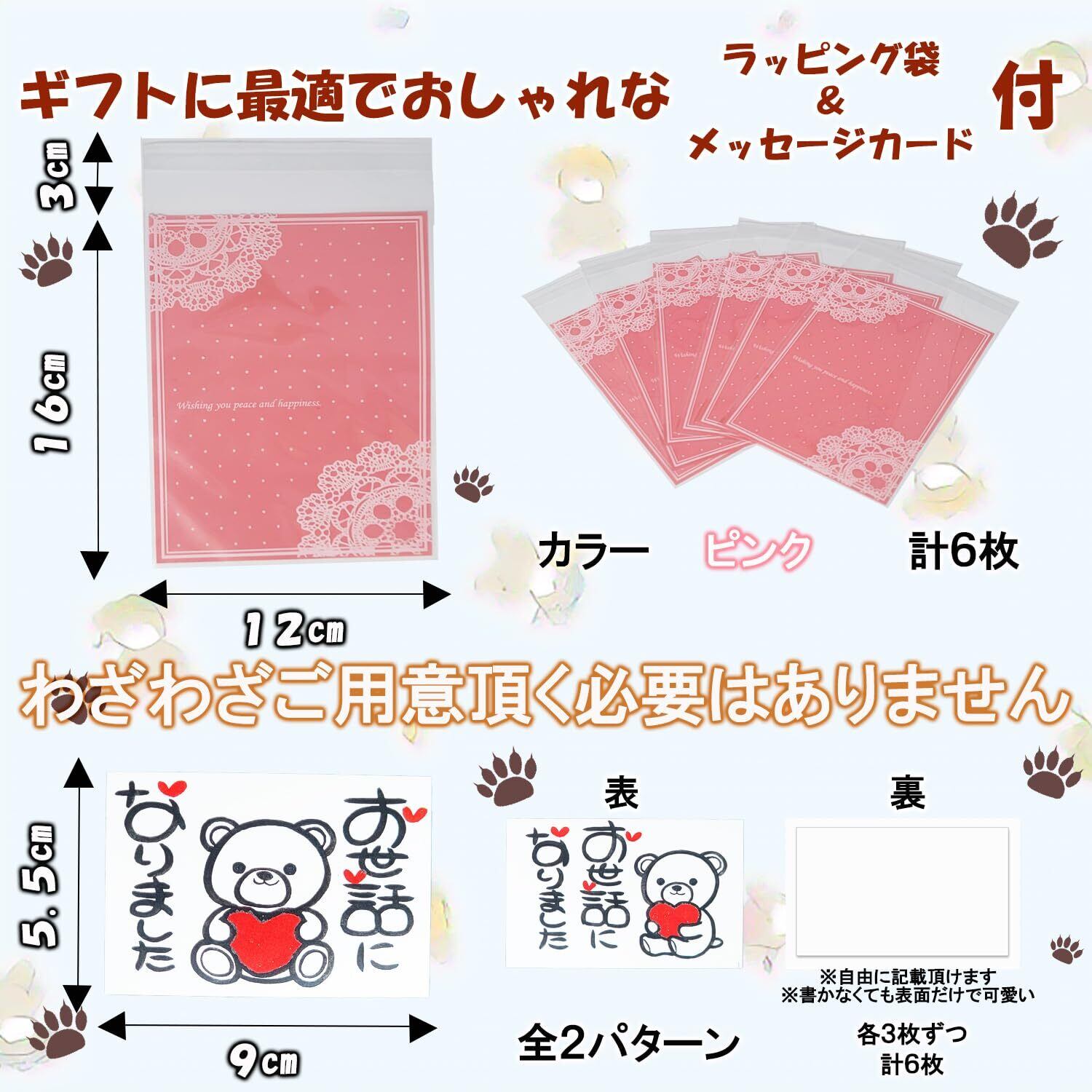 【特別感】タオルベア6色、ラッピング袋1色、メッセージカード2種、バリエーション豊富でさまざまな組み合わせが可能です。 お渡しする1人ひとりに特別感を演出出来ます。