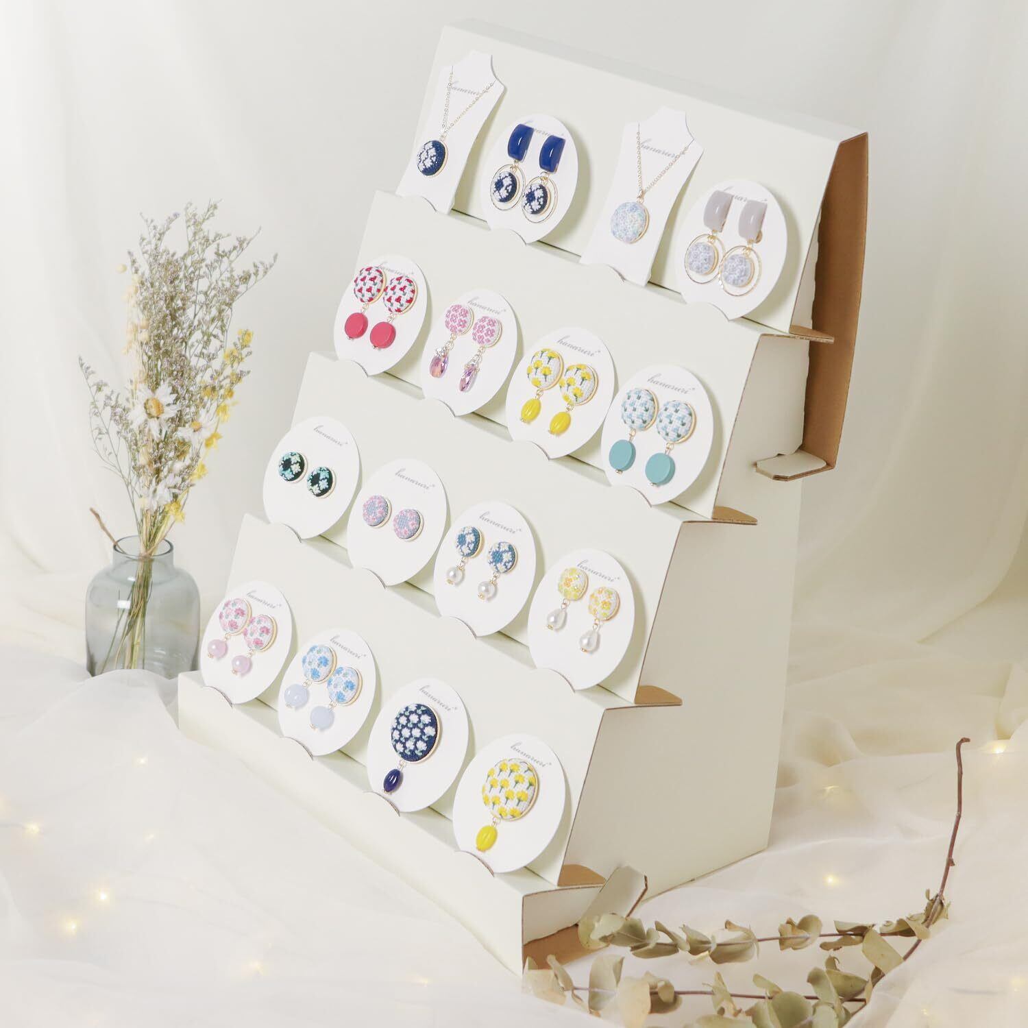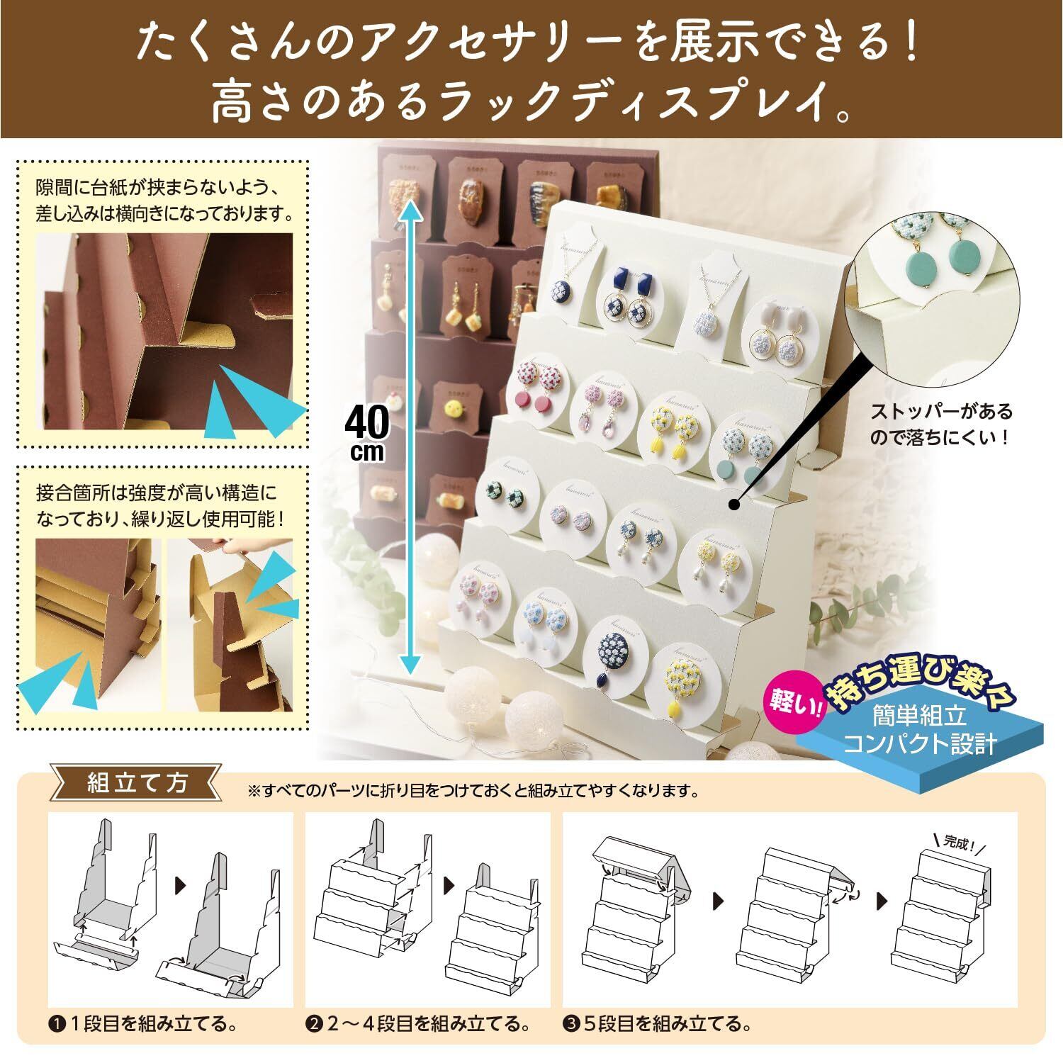 省スペースでも効率的に作品展示ができる、マチ幅が狭く高さのある紙製什器。高さがあることでより多く作品を展示でき、ストッパーに台紙をスッキリと整列させることでお客様が手に取りやすく戻しやすい設計に!