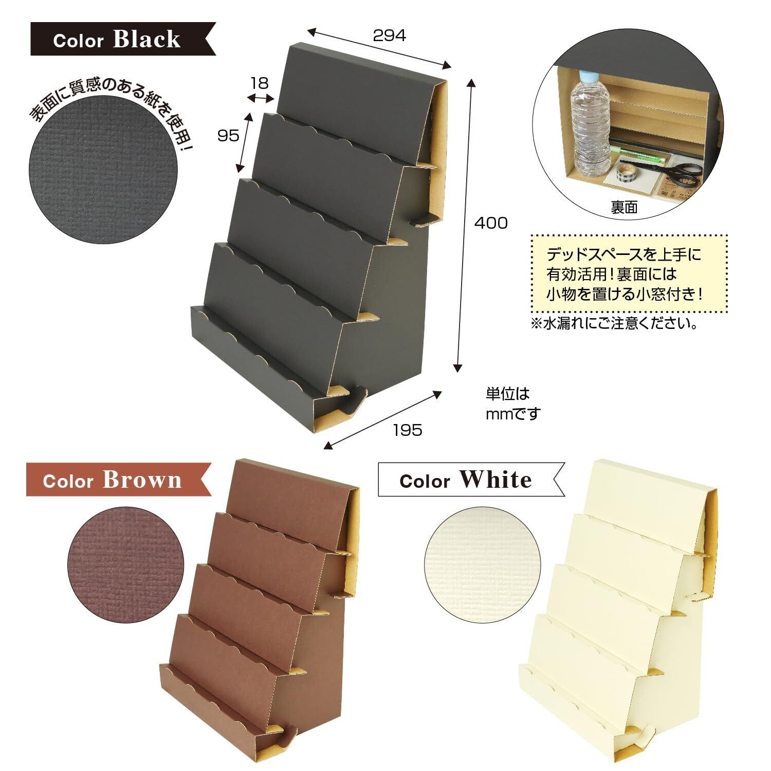 【サイズ】本体(組立時)-高さ400mm×幅294mm×奥行195mm、1段-高さ95mm×奥行18mm