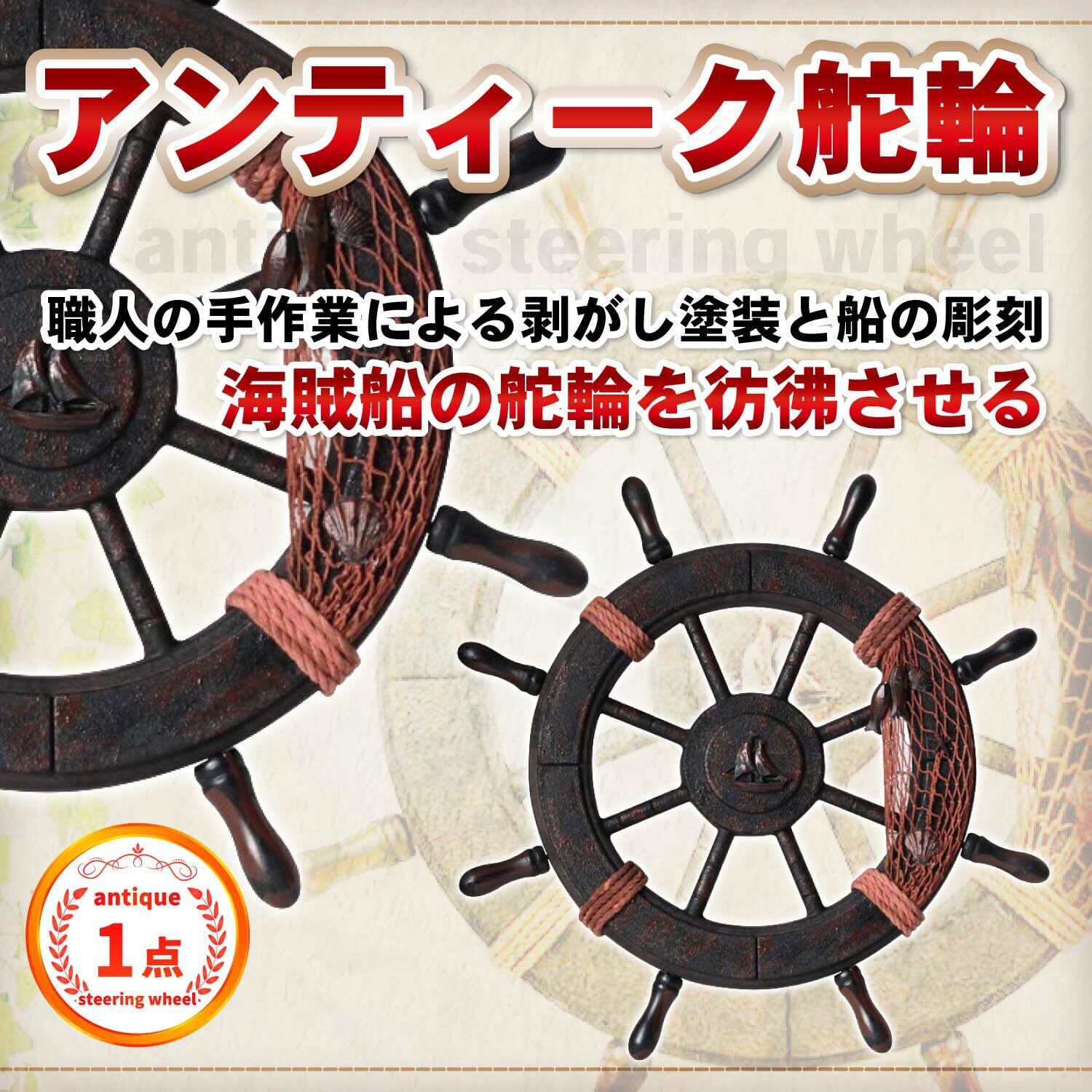 本格アンティークデザインの木製 舵輪:海賊船の舵輪を彷彿させるアンティークな木製 壁掛けオーナメントです。職人の手作業による剥がし塗装と船の彫刻が、クラシカルで魅力的な海の世界を再現します。