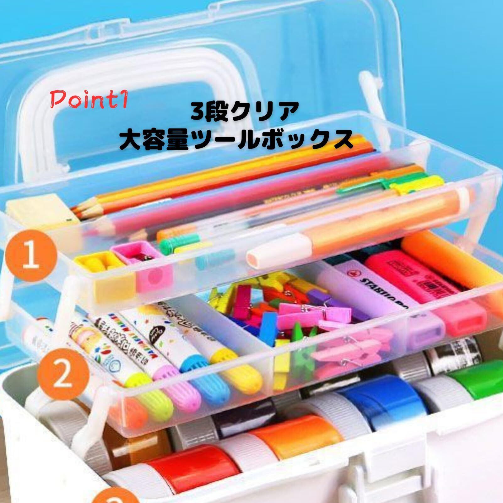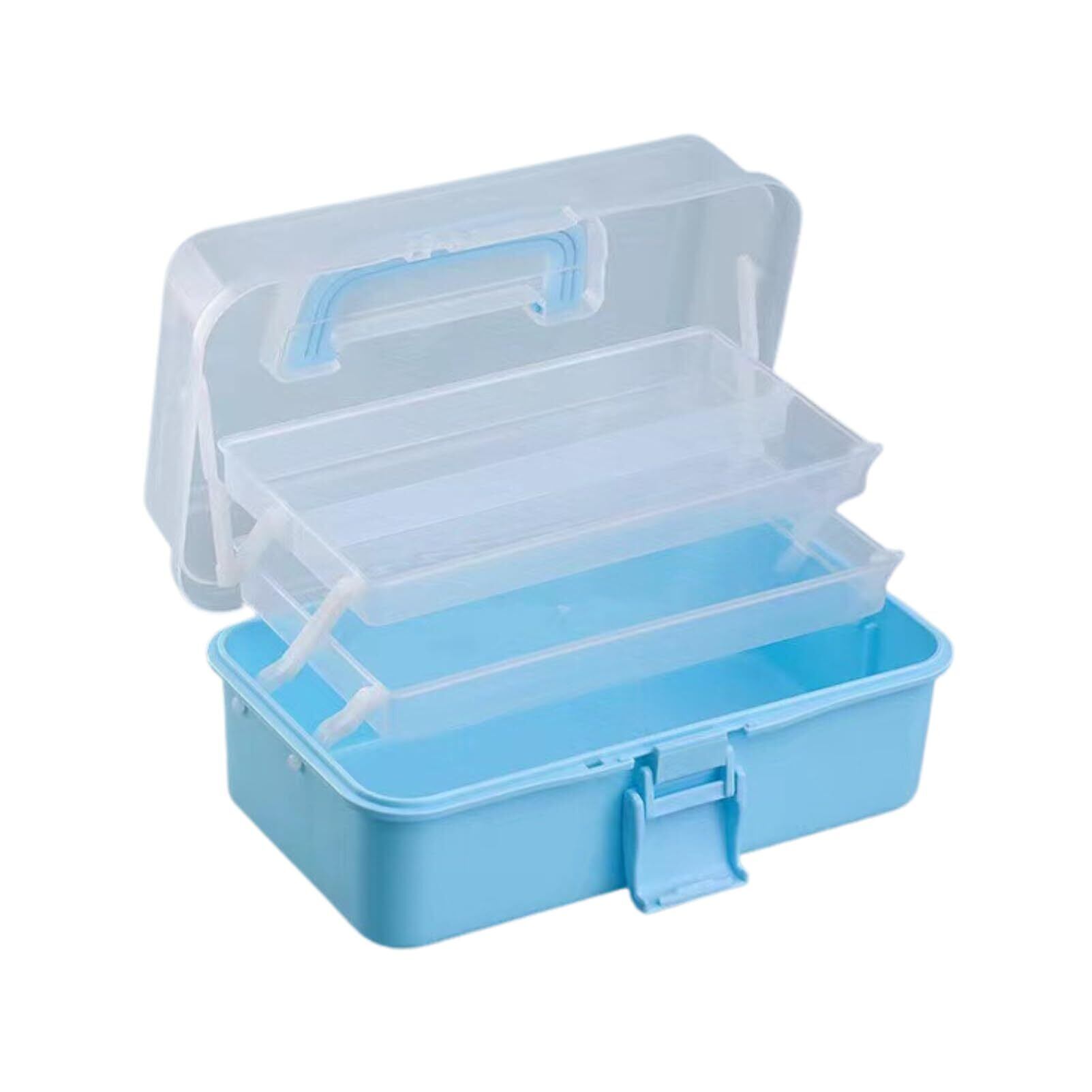 3段式大容量ツールボックス 収納箱 半透明 180度オープン 内部連動 取っ手付き 多機能 調整可能な間隔 雑貨 小物入れ 家用 車用 大容量 多機能 折り畳み 3段式 工具 裁縫道具 (ブルー)