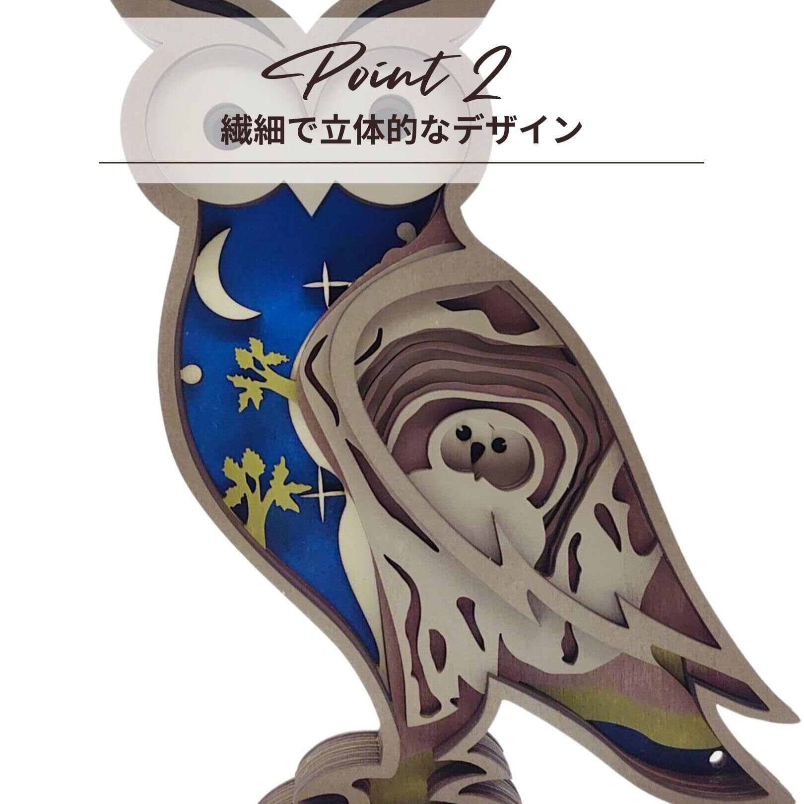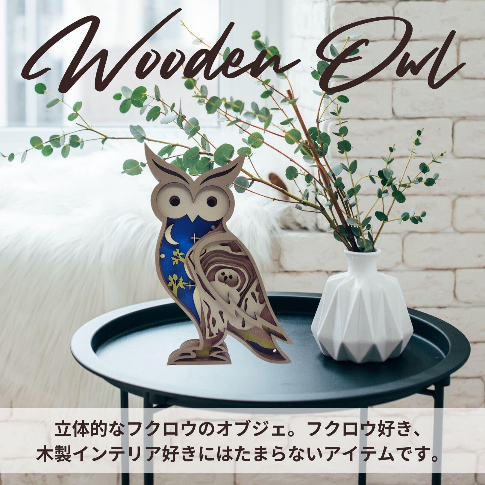 異なる色合いの木材を重ねることで、奥行きのある美しいデザインを実現。ナチュラルな木の質感と繊細なディテールが、空間に温かみをもたらします。フクロウの羽の中に隠れた可愛いデザインも魅力的で、見れば見るほど味わい深いアイテムです。