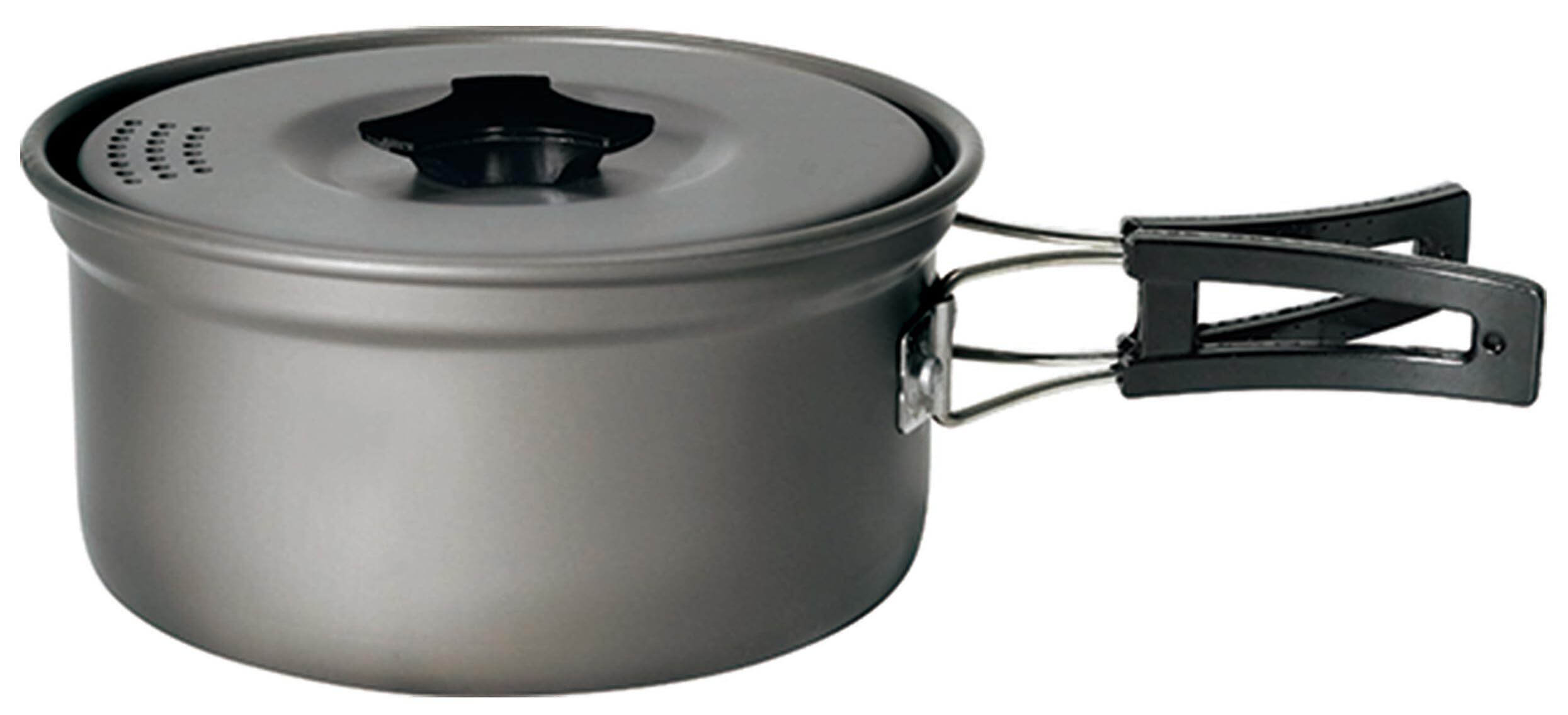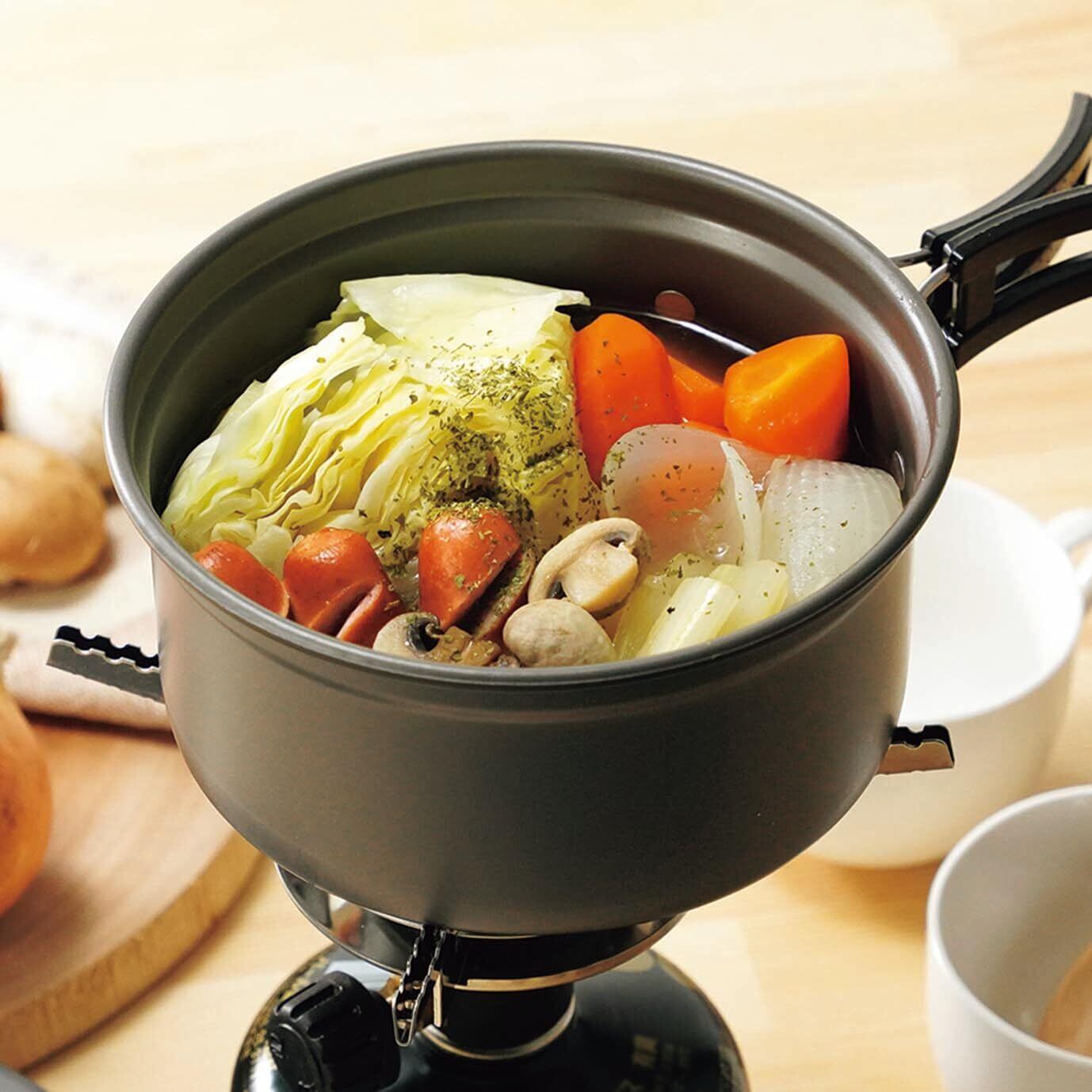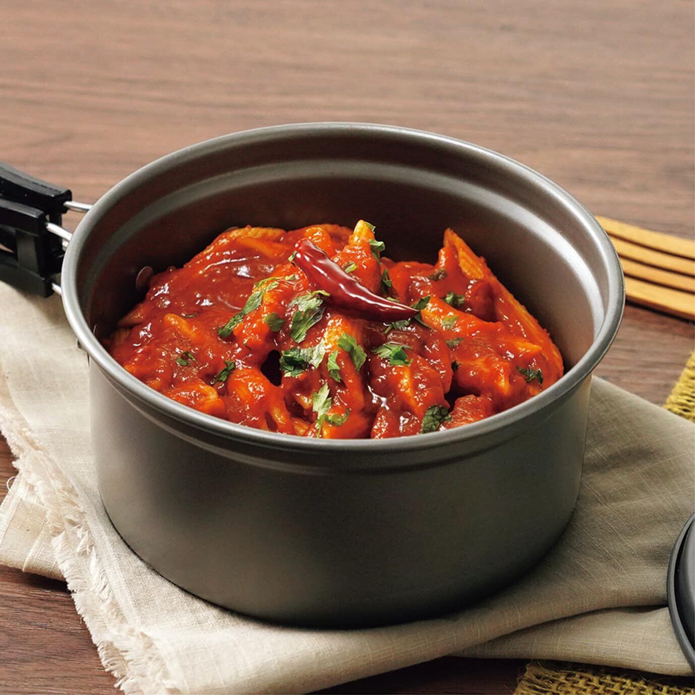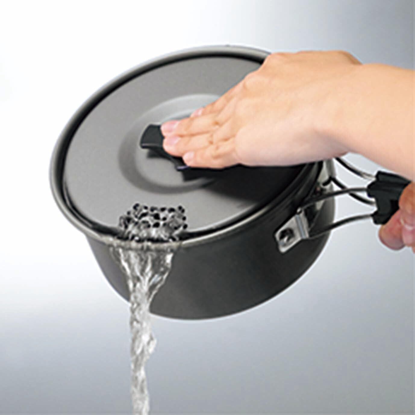 軽さと強さを両立 チタンよりも軽く熱伝導率も高いアルミニウム製。表面を硬く強くする硬質アルマイト加工で耐久性もアップ。 湯切りに便利な鍋蓋 蓋は湯切り穴あき仕様となっており、パスタや茹で物調理の際に便利です。 持ち運びに便利なポーチ付き 鍋の持ち手を折りたたんでポーチに収納することでコンパクトに持ち運びできます。