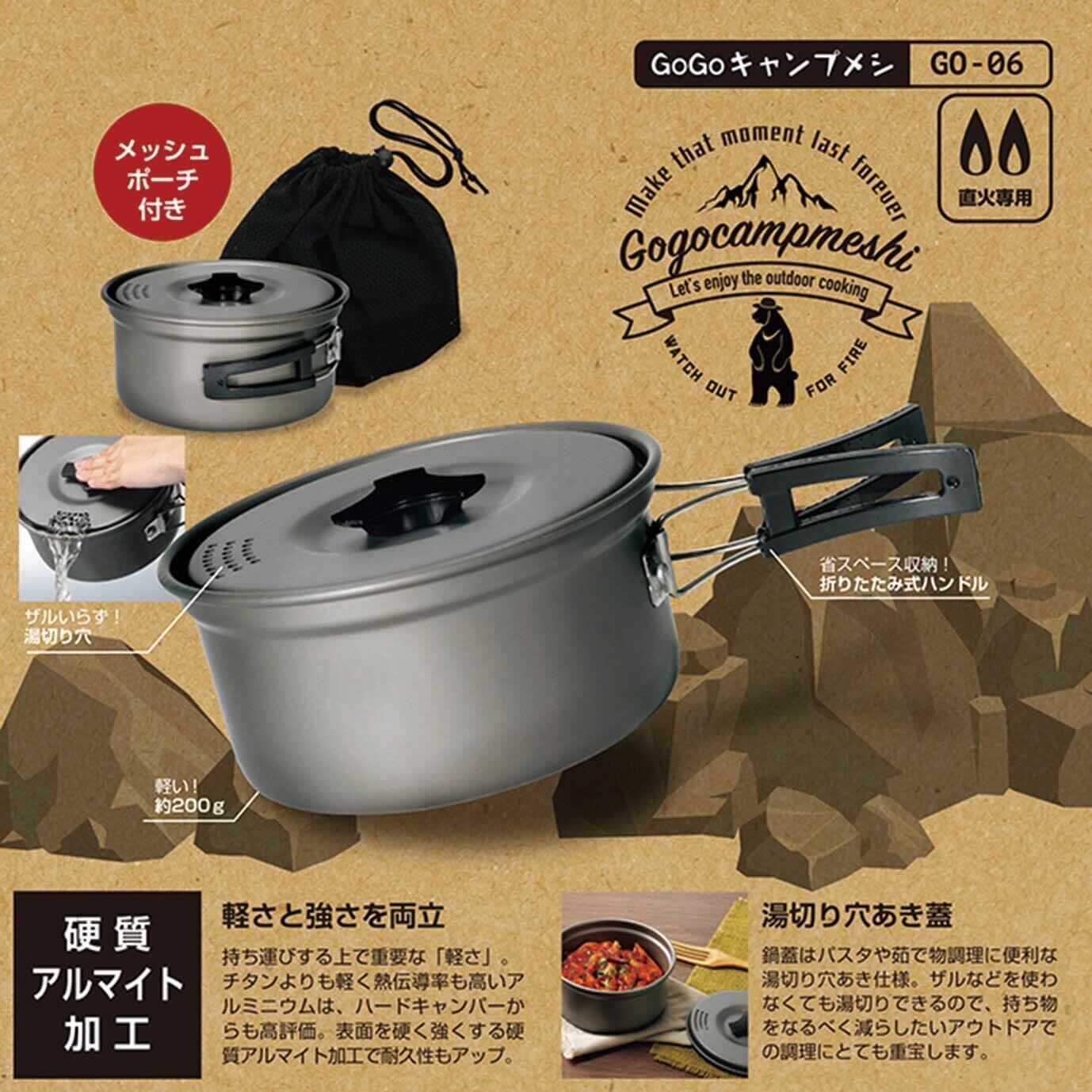カクセー ポータブル キャンピング 湯切り 片手鍋 16cm 直火専用 硬質アルマイト加工 GoGoキャンプメシ メッシュポーチ付き