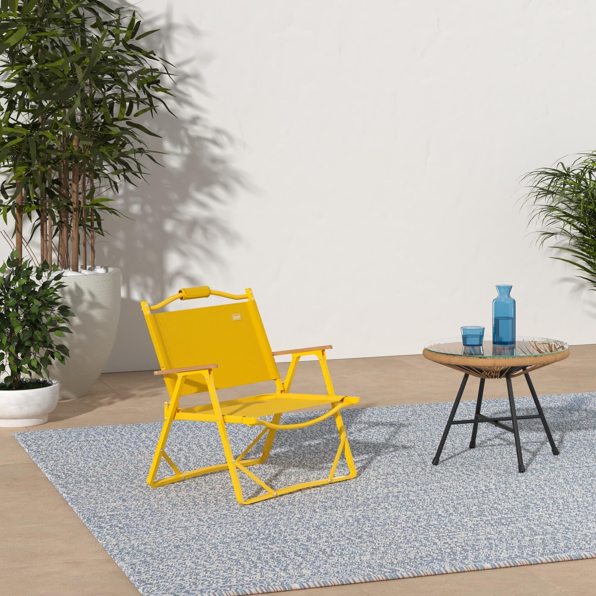 【キャンプ用椅子】燃えにくい生地で焚火シーンに最適な座り心地のいいロースタイルチェア。肌触りの良いウッドアームレスト。